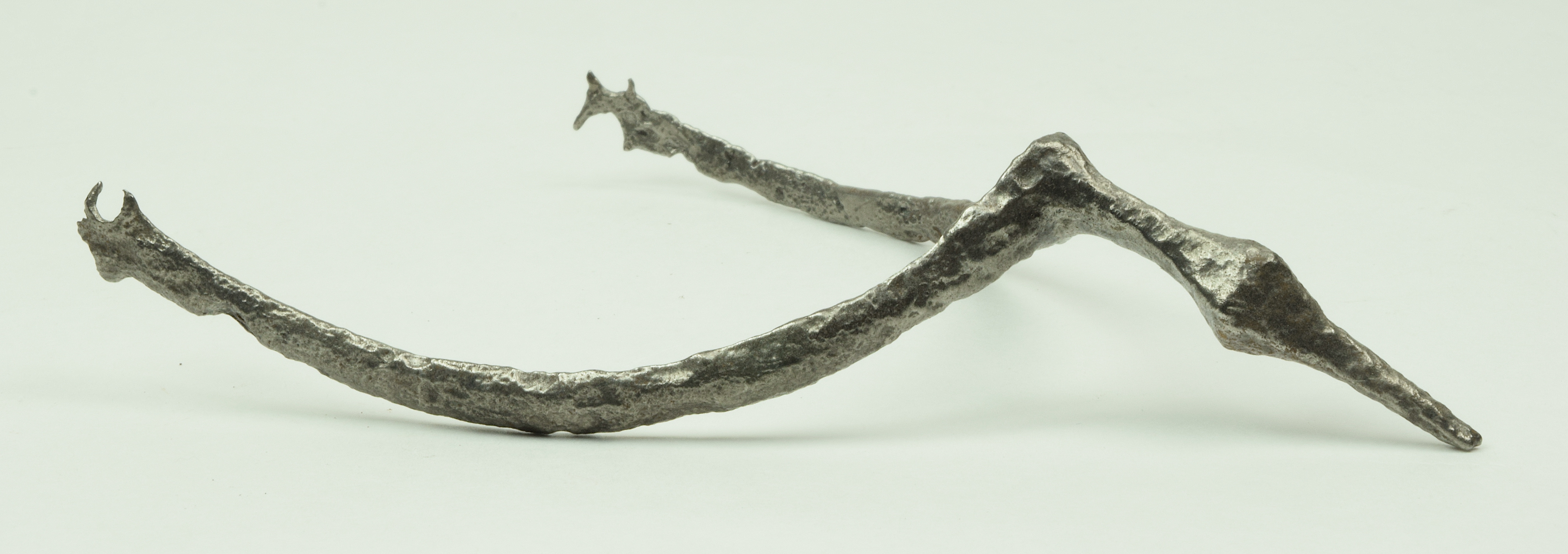 Narrow form with mildly swept arms. Narrow extended diamond shaped prick. retains portions of original figure 8 terminals. Excavated in Germany. Cleaned.