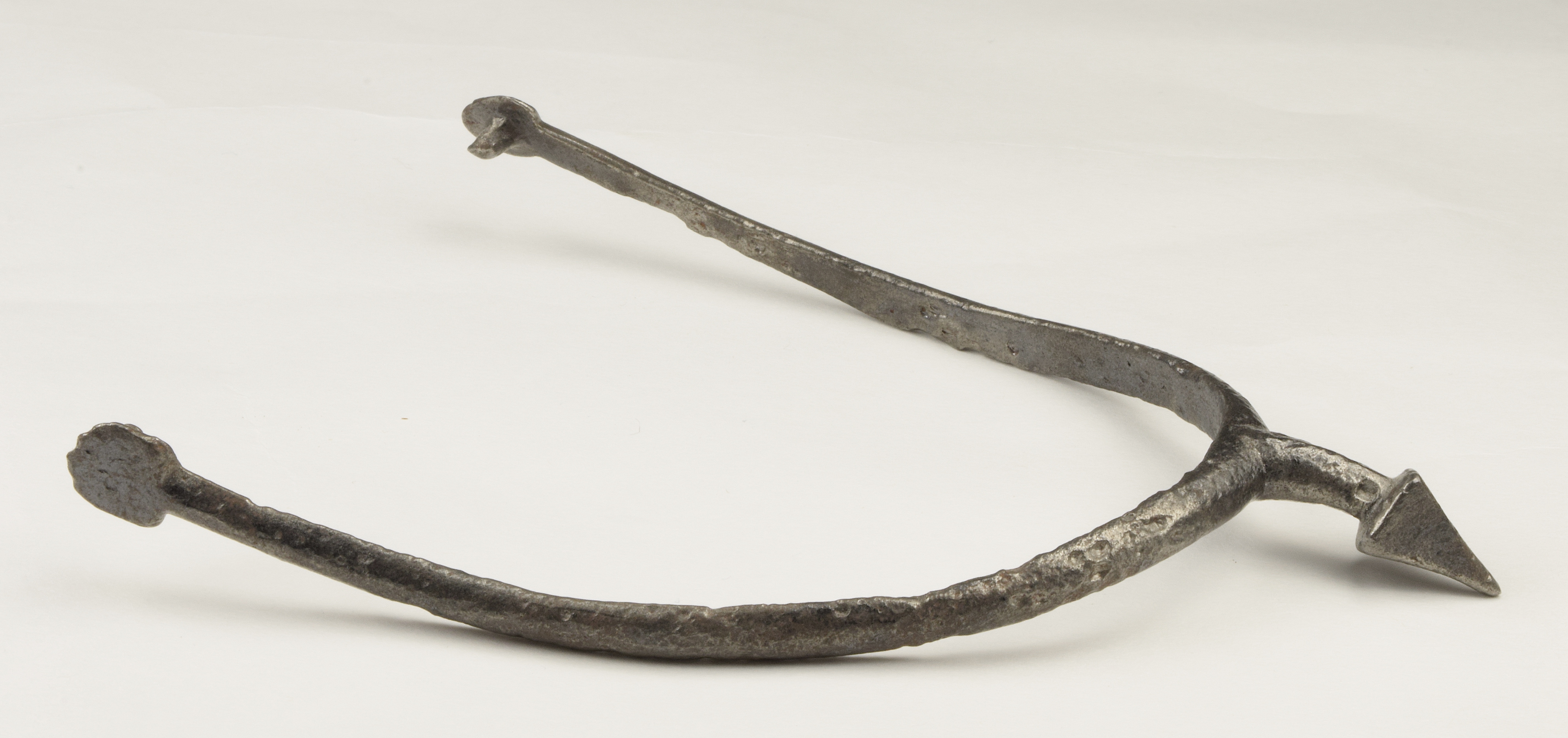 Prick Spur. Prick in the form of a relatively tall pyramid. Arms of half-round form with rounded terminals. Originally attached to the straps by means of single rivets at each terminal. Excavated in Germany. Cleaned.