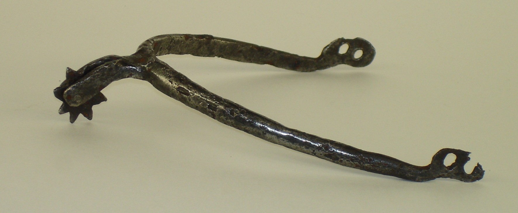 Spur. Straight arms with figure 8 terminals. Small star-shaped rowel on a short, curved stalk. Excavated in Germany. Cleaned.