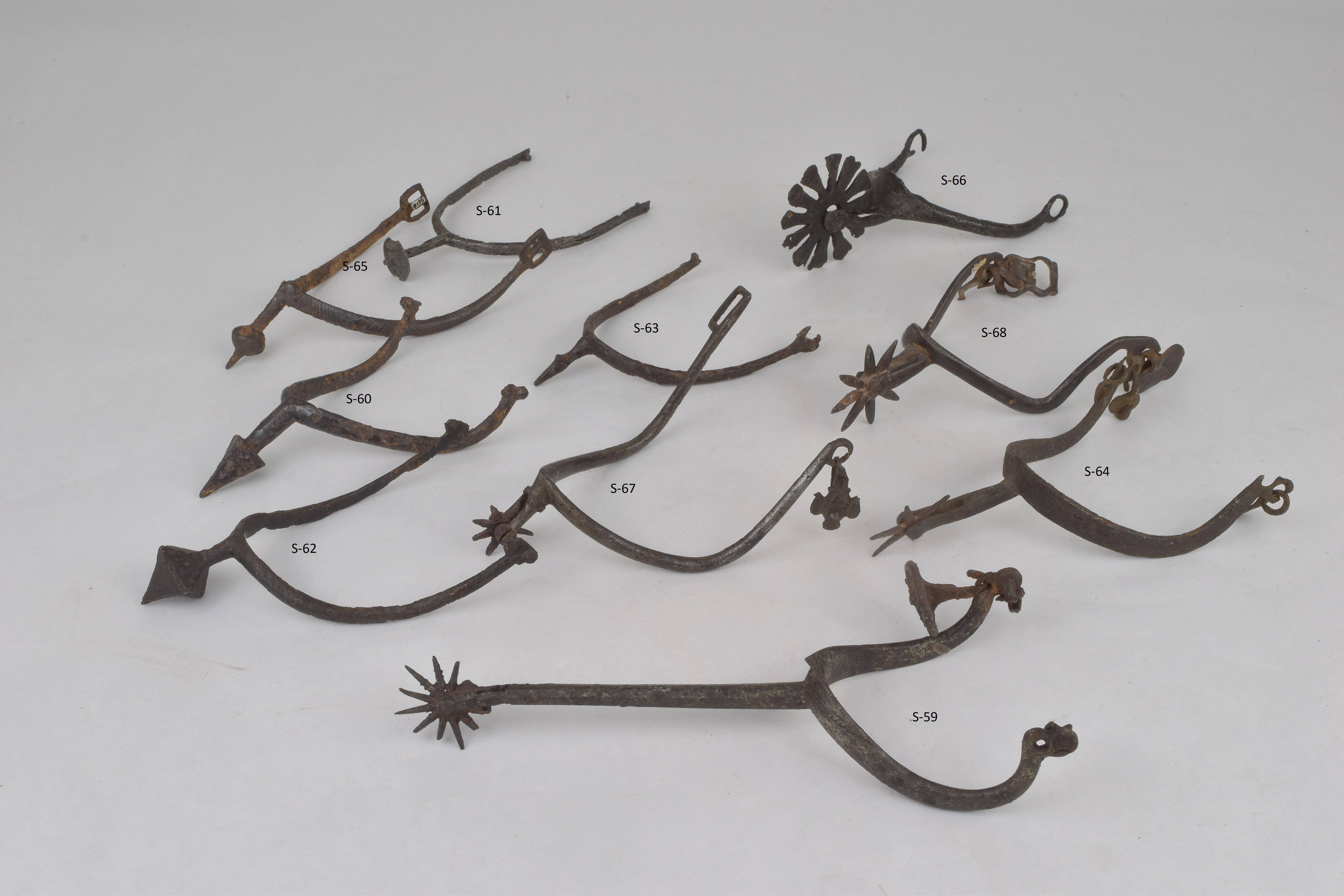 Rowel spur. Narrow, rounded arms terminating in a loop on each end which would have carried the strap mounts. Short tapering stalk which spreads to a large rounded section which carries the large rowel in the form of petals. The center of the body rises to a point at the base of the stalk.
