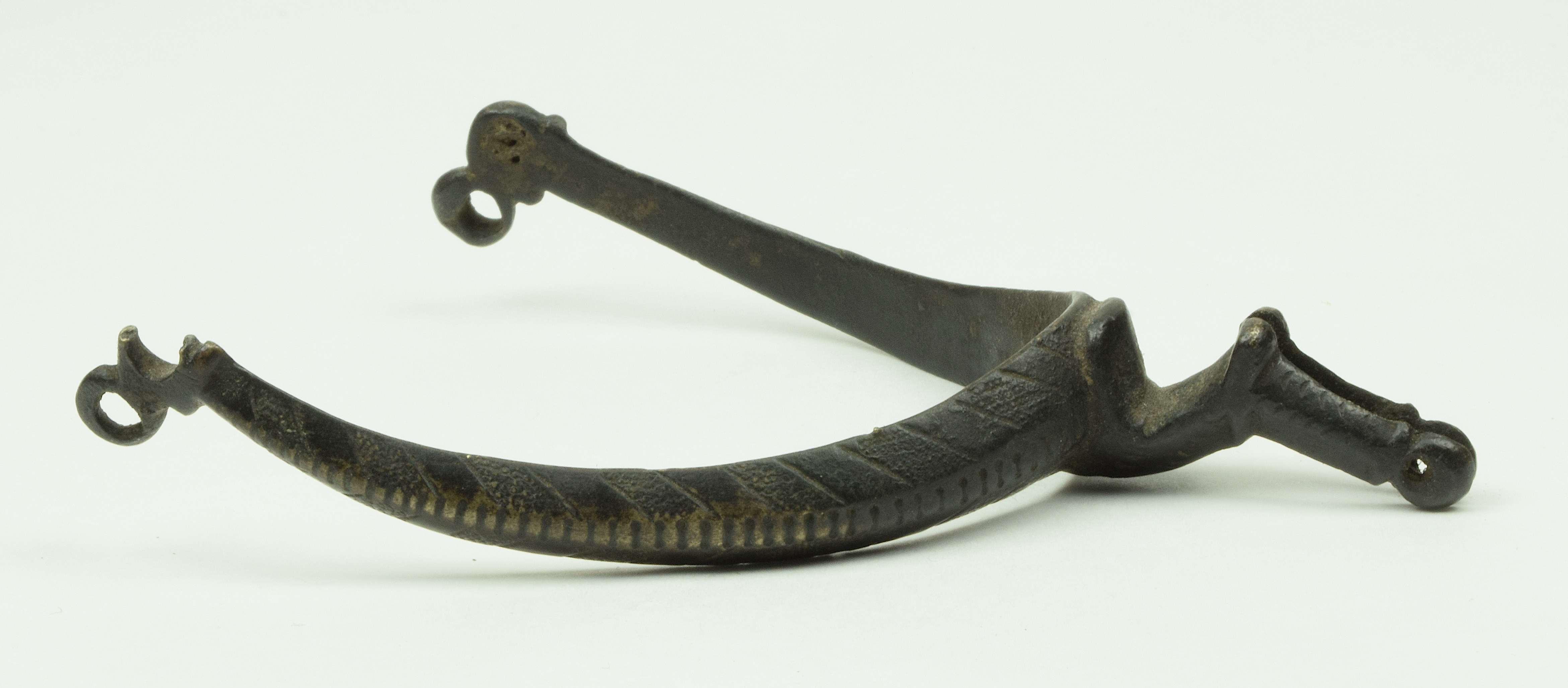 Cast copper alloy. rowel missing. Figure 8 terminals on both ends. One terminal broken. Nice diagonal filed and punched decoration.