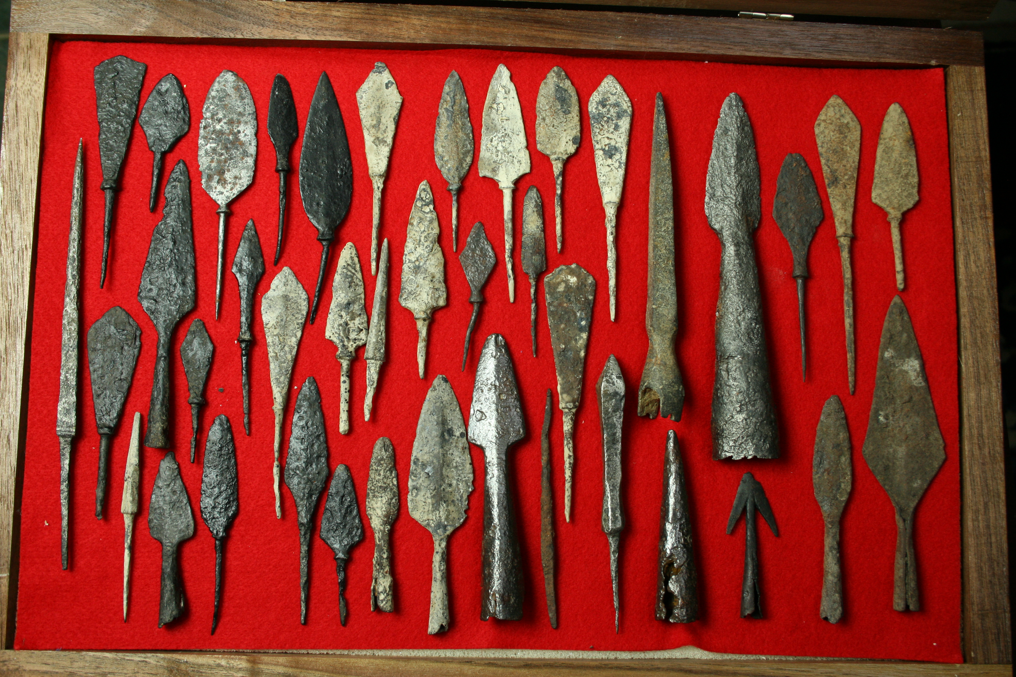 Excavated. A large number of arrow, pike, spear and crossbow bolt heads.