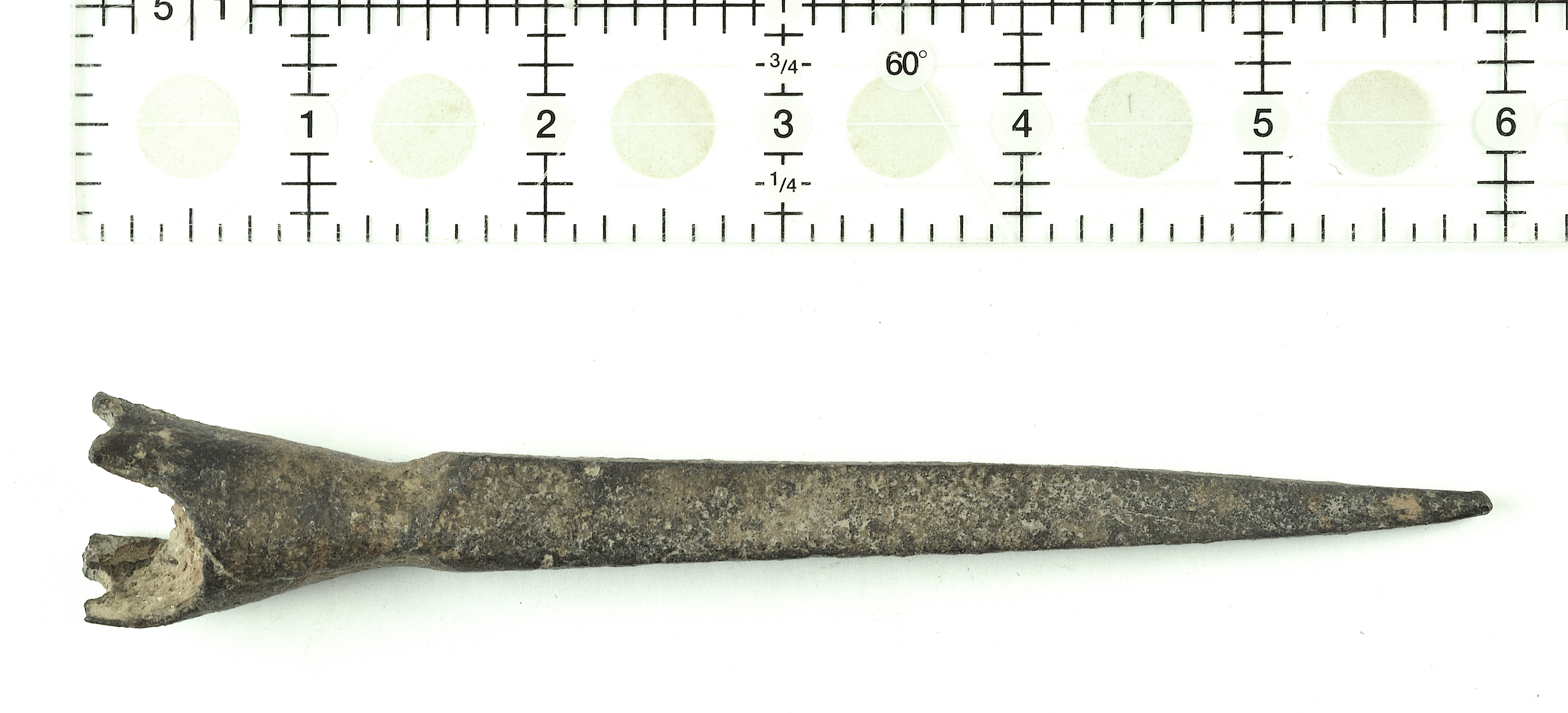 Long square point. Narrowing to a rounded waist below a short round-section socket with 2 strap extensions. Excavated, but in with good patina. Staps broken at the first rivet. Found in the Thames at Custom House Quay near Southwark Bridge.