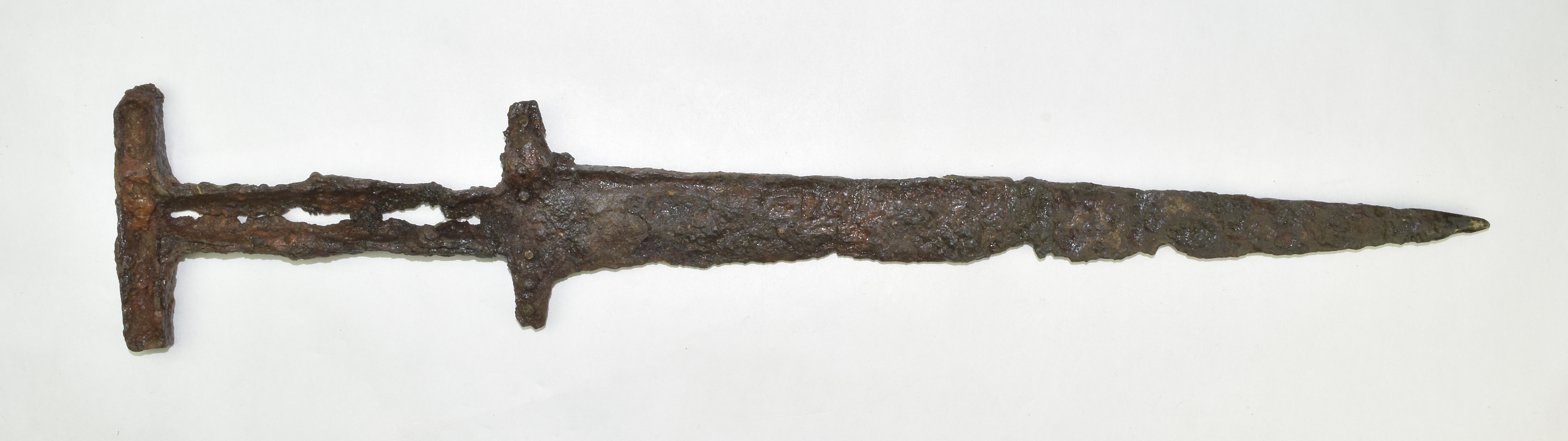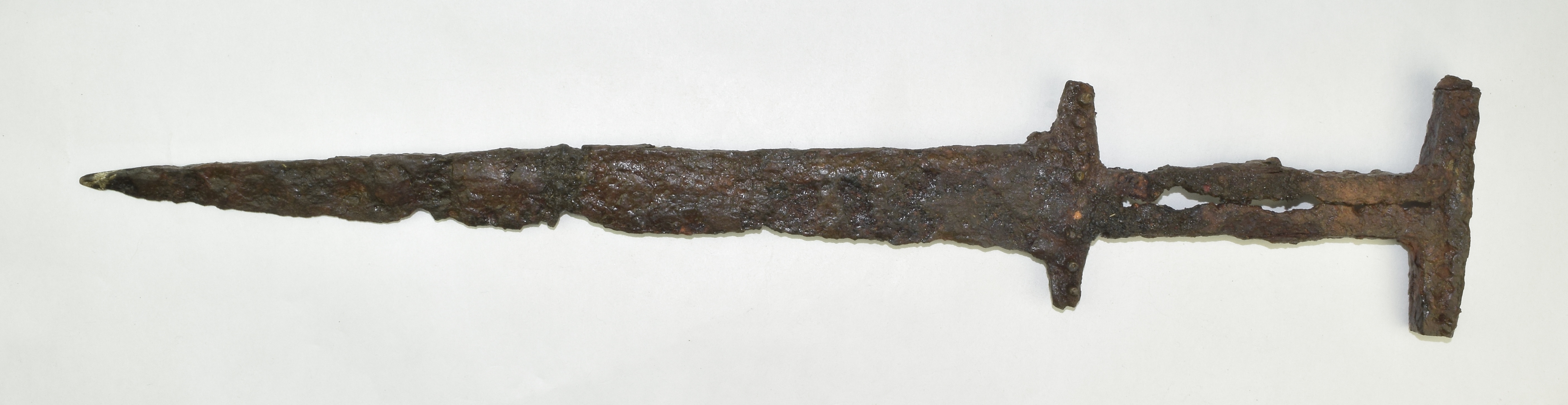Basilard Dagger. Hilt of typical 'I' form. Somewhat worn excavated item. Handle missing. Single edge distal taper on the blade. Single narrow fuller on one side of the blade that extends 3/4 of the length of the blade. The fuller is .187 in. from the spine. Oringinal handle would have been formed of 2 sandwich scales secured by pins. Scales missing, several pins remain. The handle is hollow on one side.