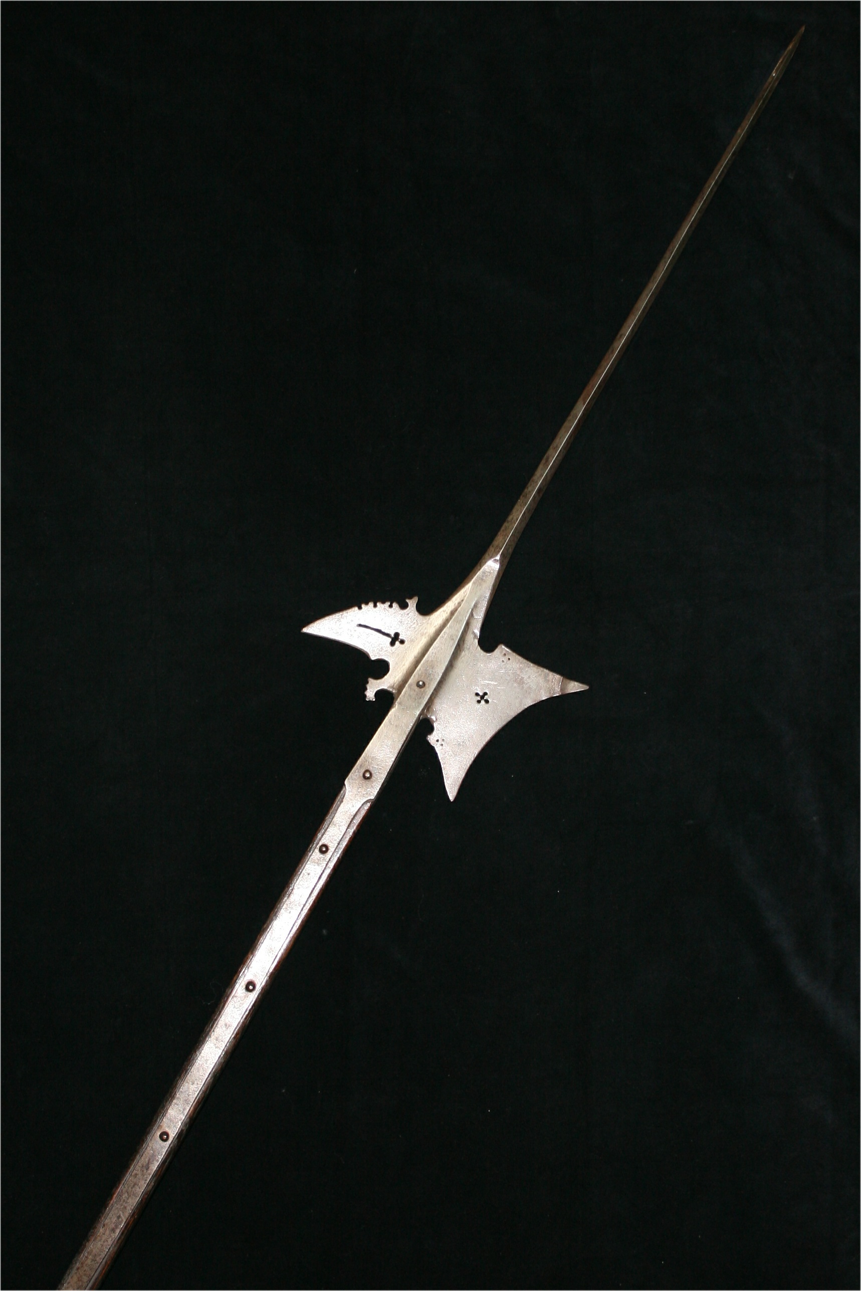 Halbard. German or Swiss. Long spike of stiff diamond section, axe blade with slightly curved cutting-edge and pierced with a central quatre-foil and a triangular set of holes above and below. Fluke pierced with a trefoil with elongated stalk. . With decorative cusps on the fluke and some on the blade. Head terminates as 2 long straps secured to the sides of an old haft. Head 35 1/4 in. long from the point to the base of the socket.
