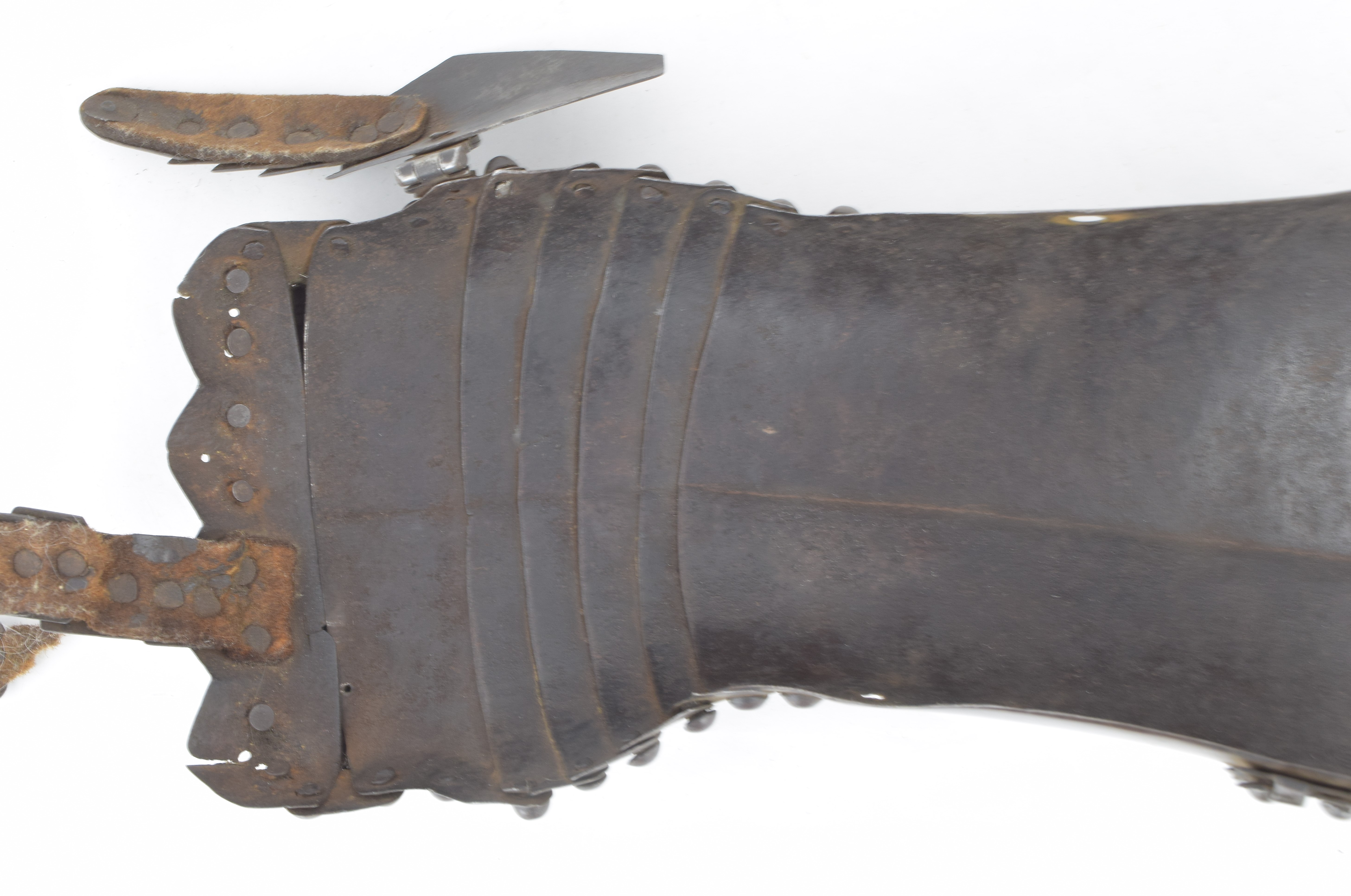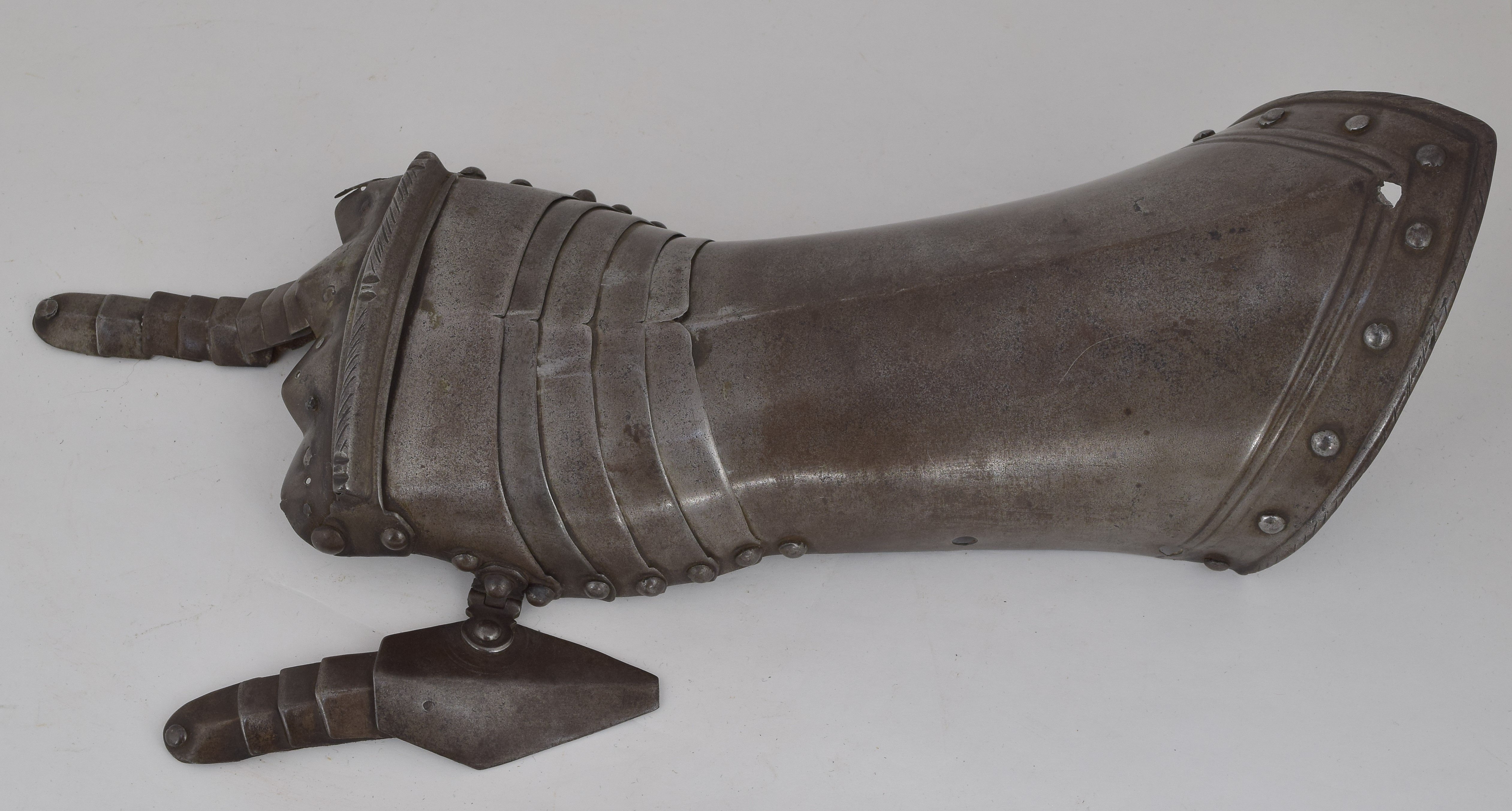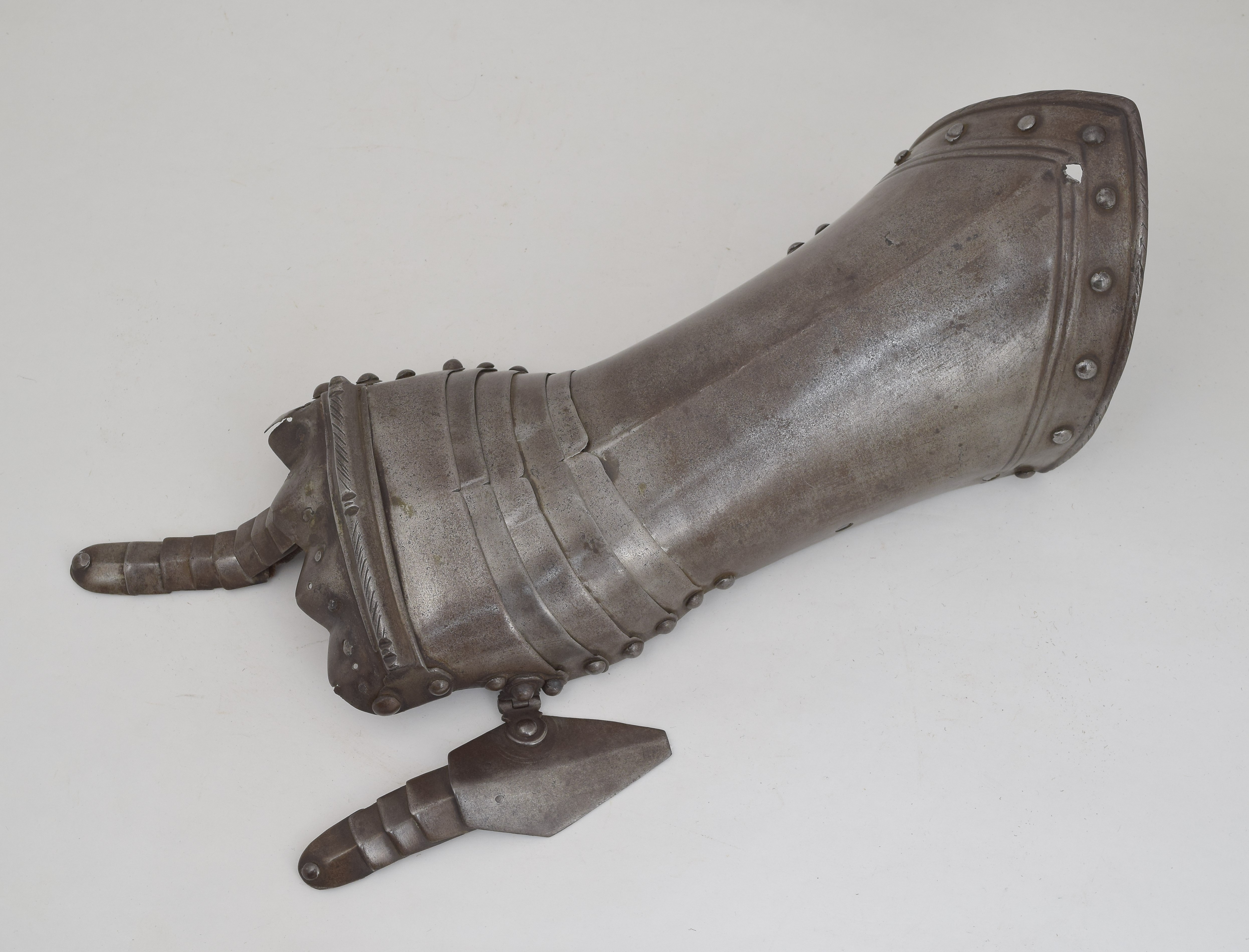 Long, pointed cuff formed with a gentle even flare over the entire length of the cuff. Central point. Border rolled and roped with an additional double row of raised decoration. Lining rivets around the edge of the cuff. Back of the hand covered by 5 articulated plates, the final plate larger than the rest. Knuckle plate decorated with a roped ridge with additional decorative grooves at the end and center. Thumb plate attached by a hinge. Fluted plate joining the knuckle plate to the fingers. One finger remaining. Interior cuff plate missing. Originally it would have been secured by a hinge on one side (half of the hinge remains) and a pin on the other side that would have engaged in the hole in the outer plate. A gauntlet of similar form with similar edge decoration is in the Keinbusch collection in Philadelphia.