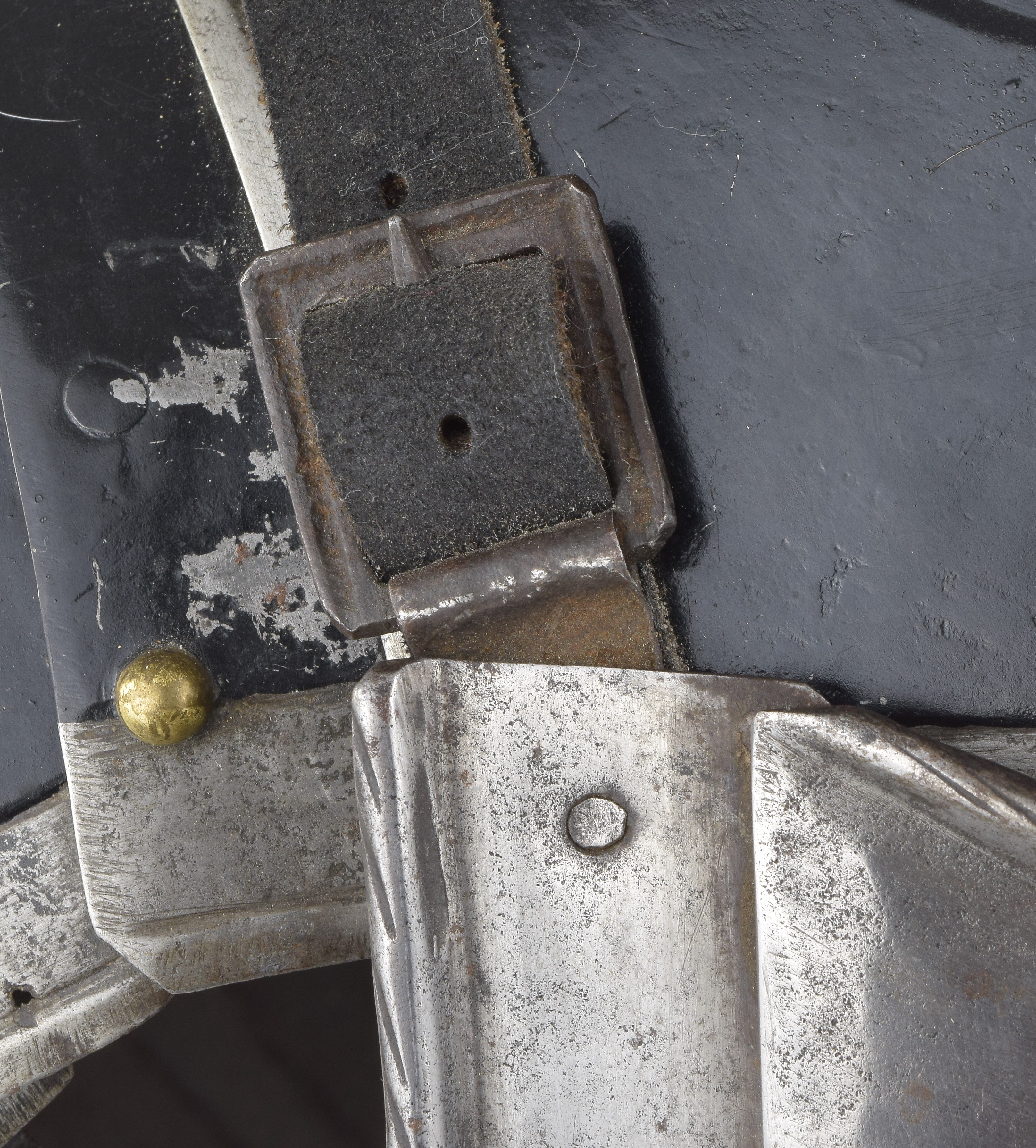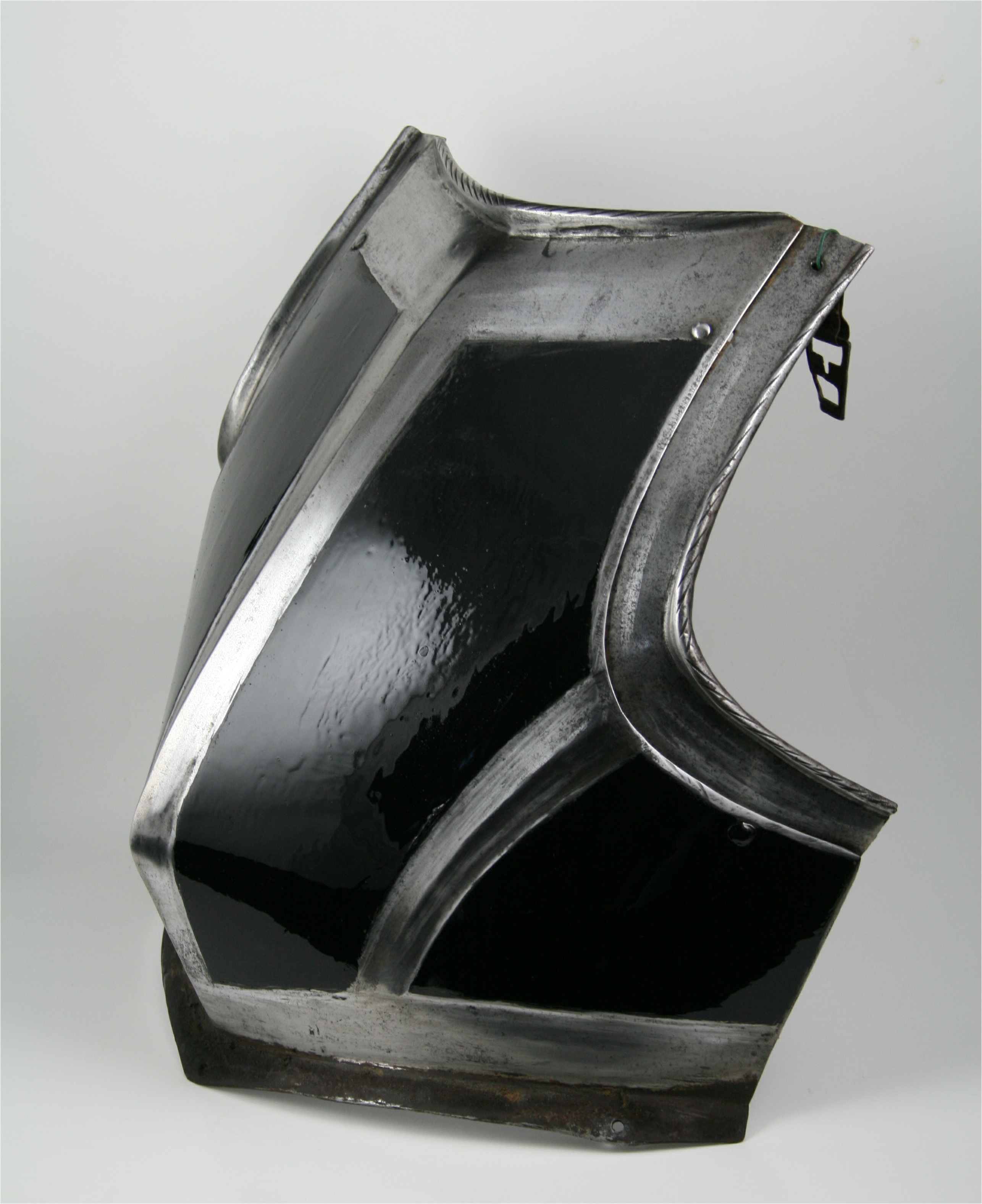 Black and white with a pronounced point below the center of the chest. Neck bordered by an inward turned, tapered, roped roll. Arm holes bordered by sliding gussets with inward turned, tapered, roped rolls. Waist flared for the fauld. Breast decorated with recessed polished bands, the overall surface rough from the hammer. There is an indistinct mark at the neck. Reblackened. There are buckles which appear to have been manufactured by being pierced from sheet at the shoulders. They attach to the inside of the gussets. This would suspend the breastplate and serve to return the gussets to the outward position. One missing its tongue and detatched.