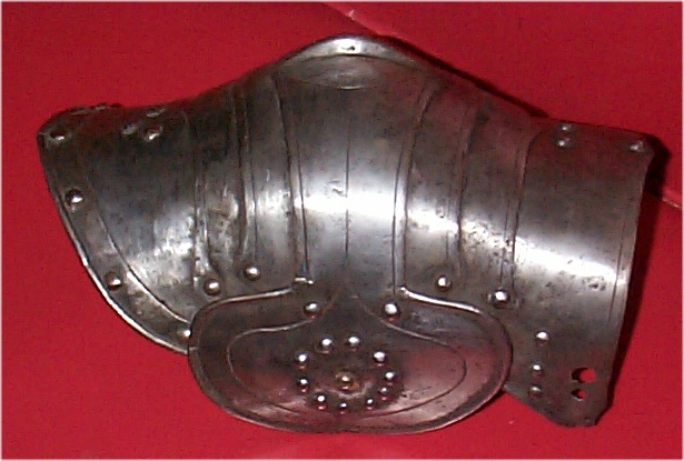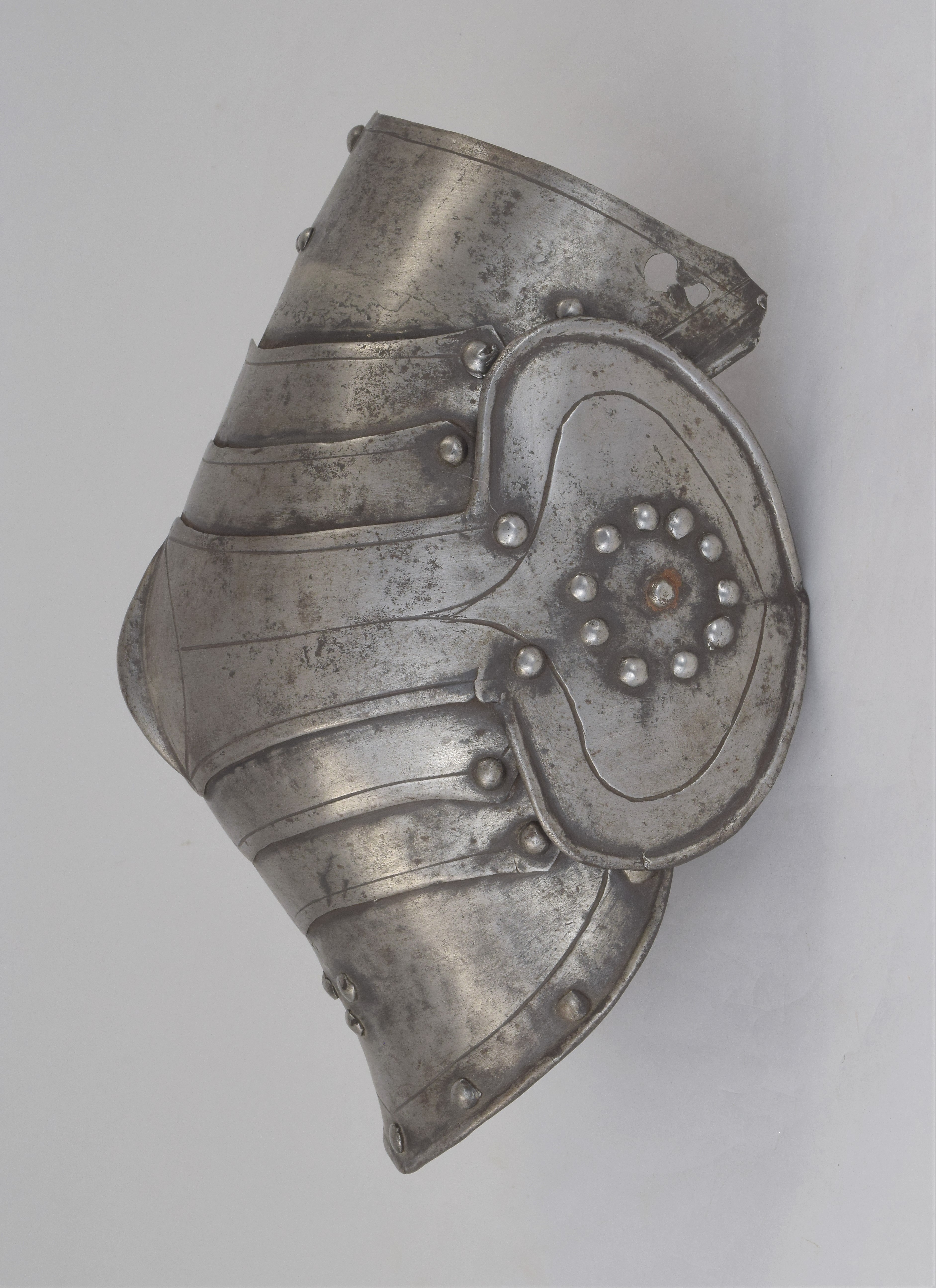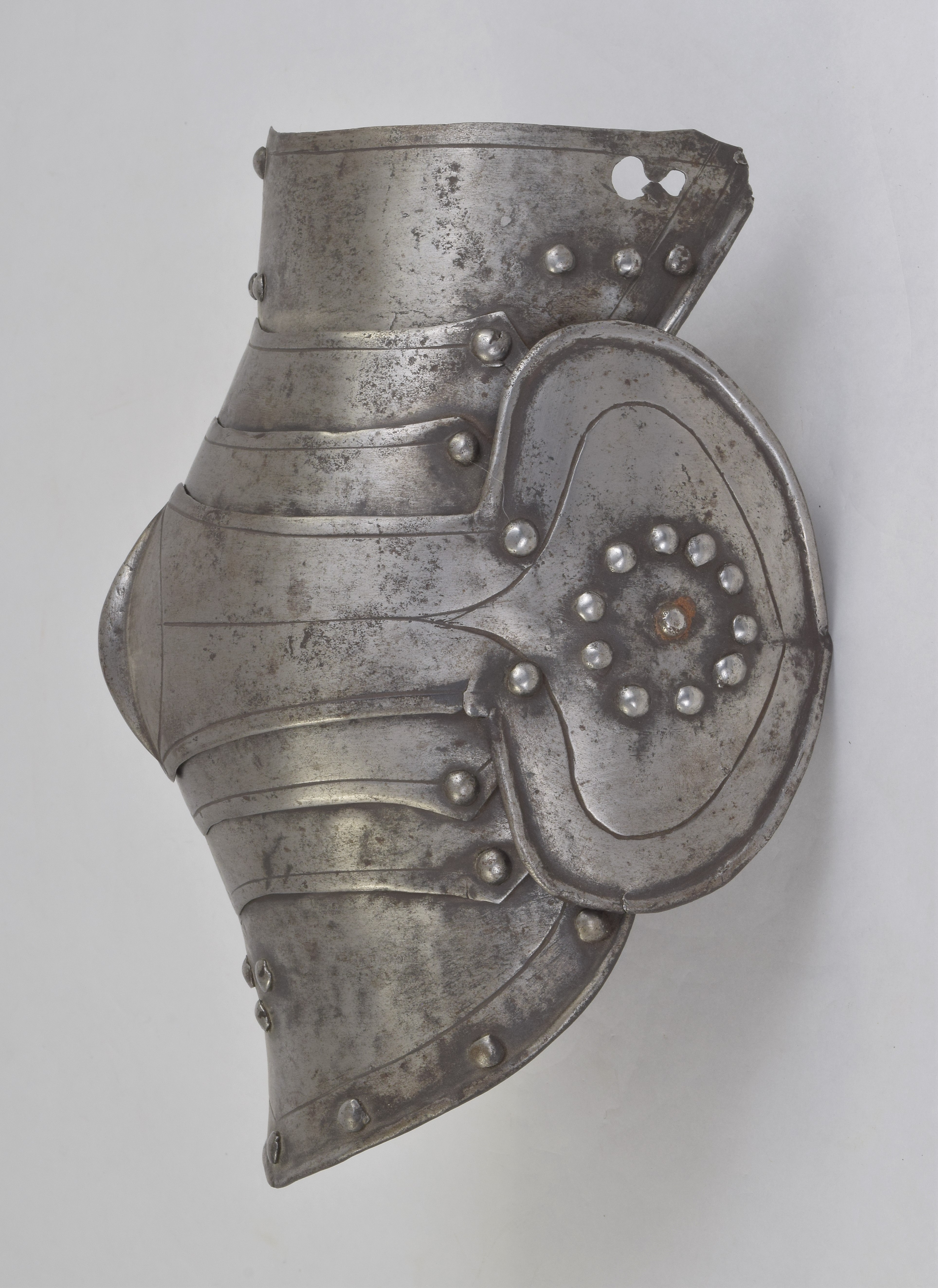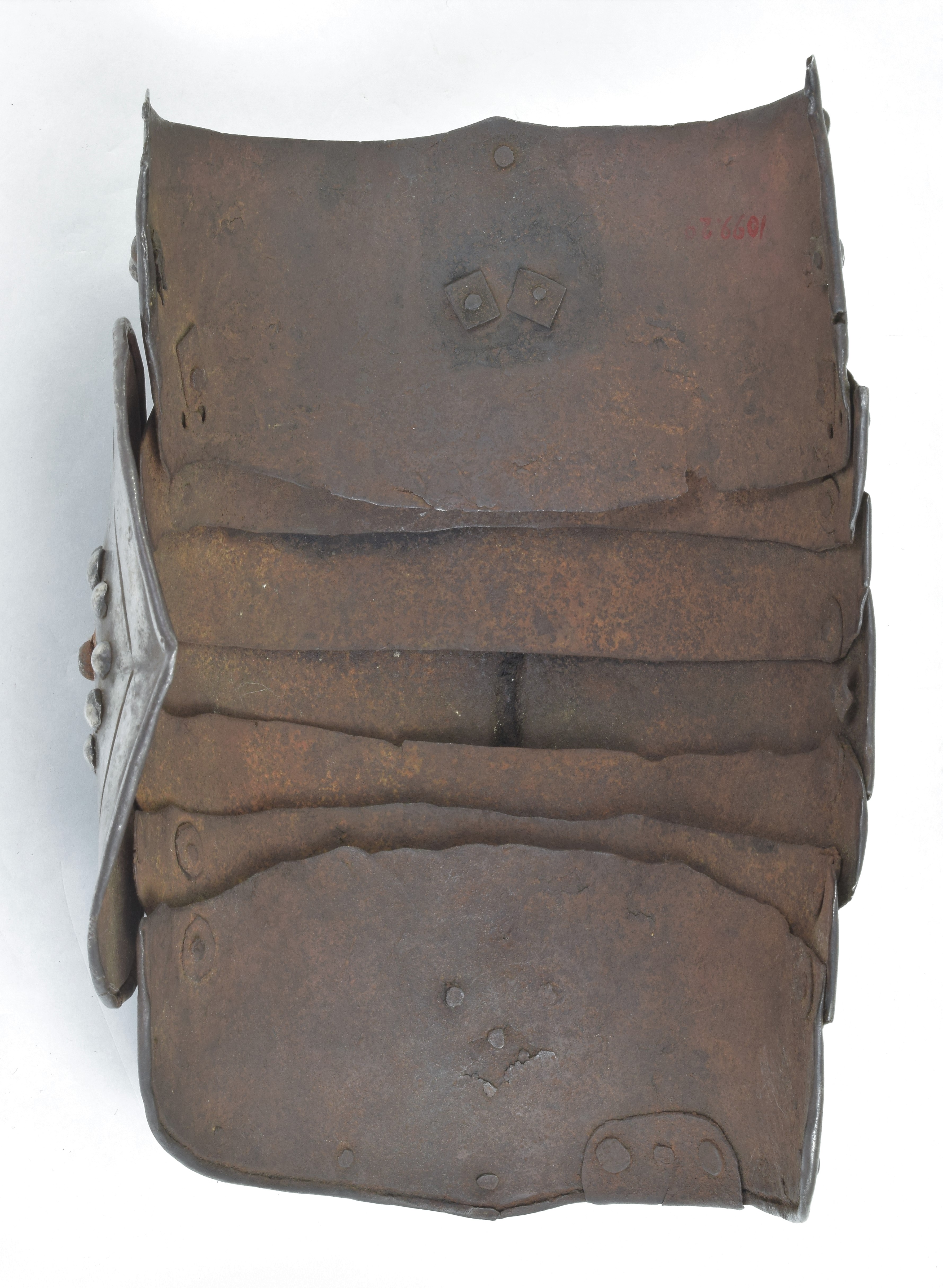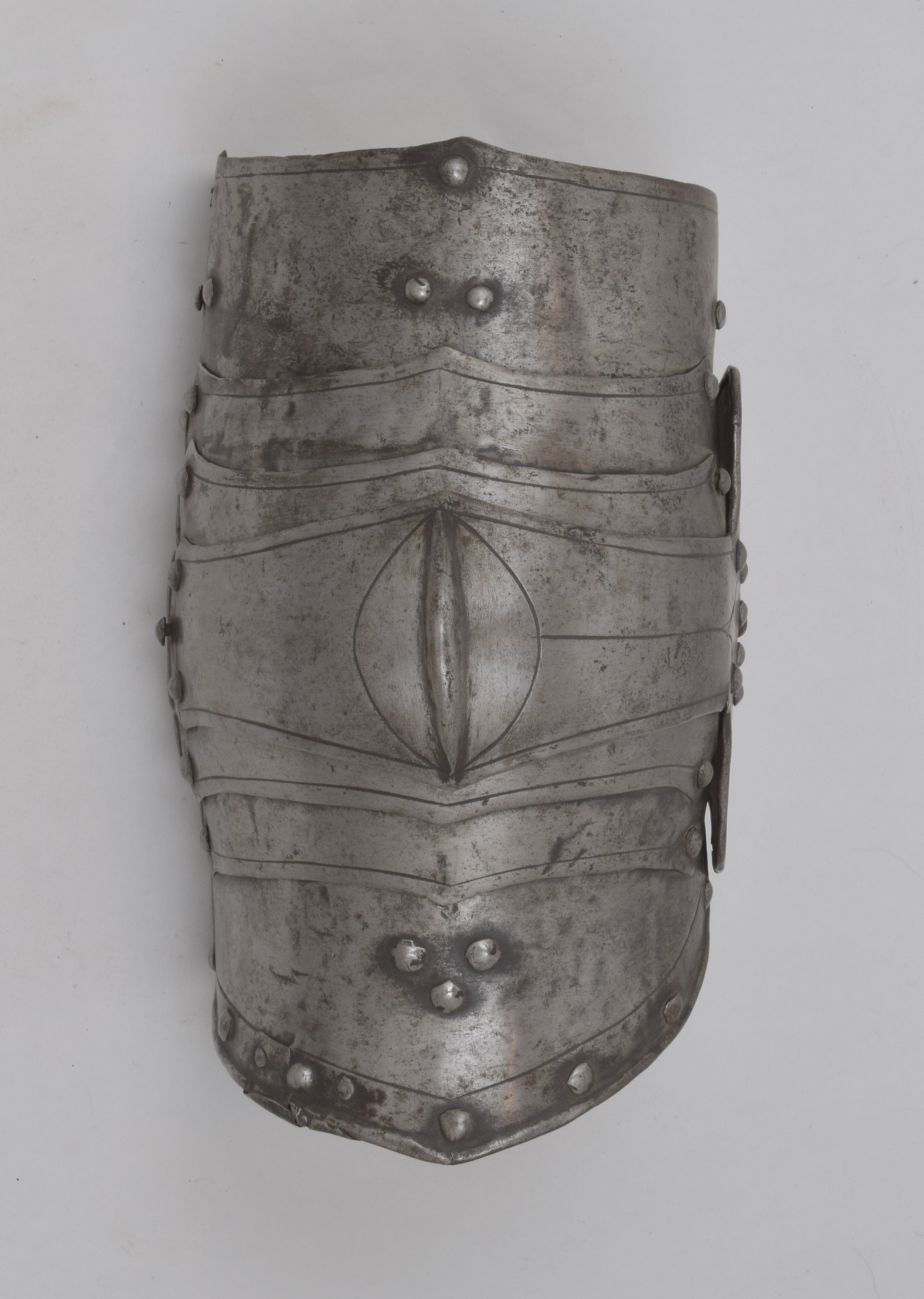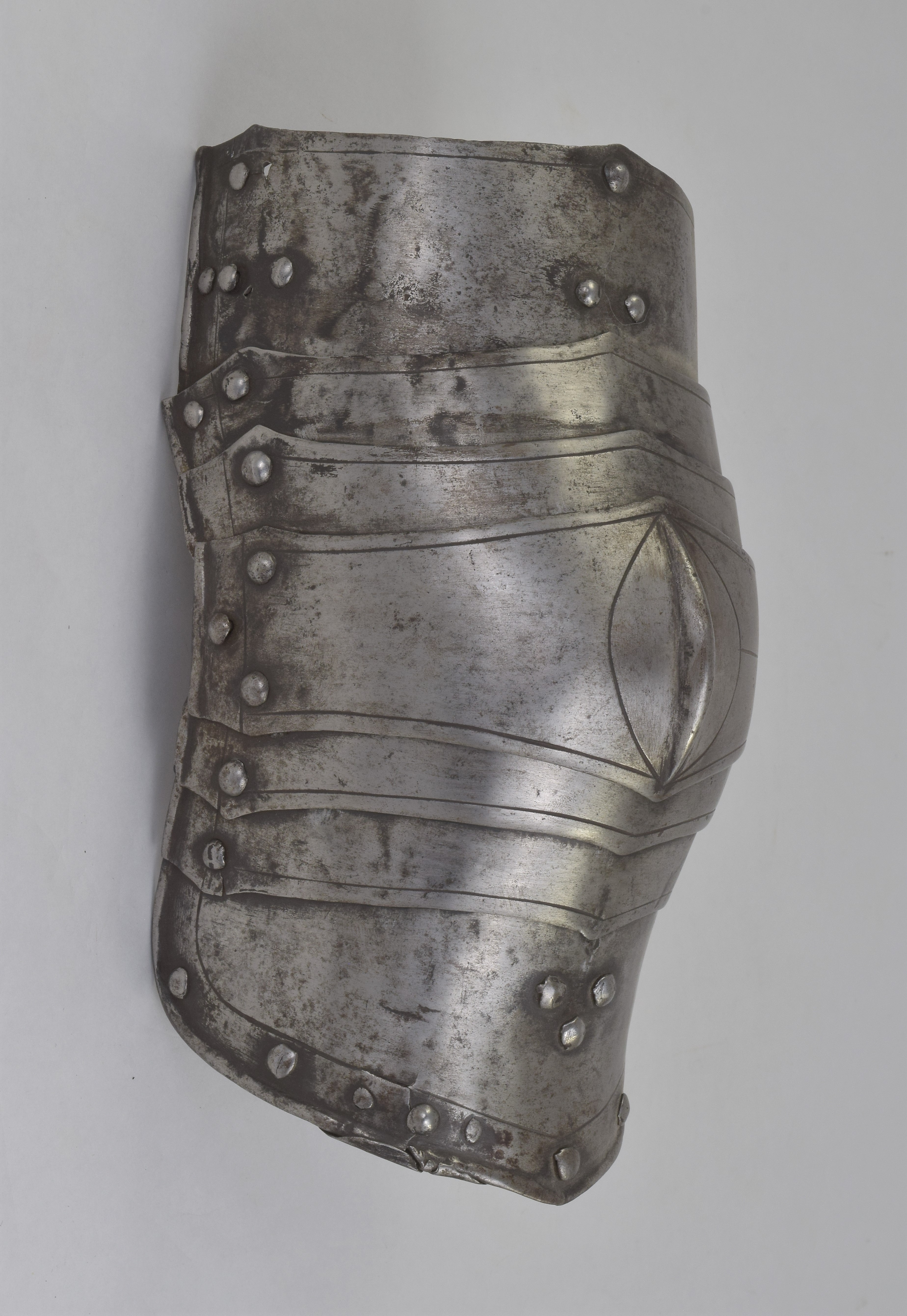 Almost certainly used with long, knee length tassets on a cuirassier armour. Seven total plates. Cop with central raised ridge, two narrow lames above and below the cop, one longer lame below with inward turned roll at the edge and one larger plate at the top that would transition to the tasset. All plates with chiseled line borders, rolled edges, main plates with rivet decoration. From the Boston Museum of Fine Art - including 1929 acquisition number - 1099.29 Old de-lamination in some plates, old patch to lower plate. Very similar in style and form to the knees on a three quarter armour on display in Cleveland Museum of Art on loan from the RA Inv II 98/IV.863 38.2008. Images show it in its straight and fully bent form. The minimal movement is possible because it would never have been worn with greaves. This allows the knee to be covered, but the leg can move within it. For another similar knee see item number A-155. For a full tasset of the same period see item number A-248, item number A-311 or item number A-331-f..