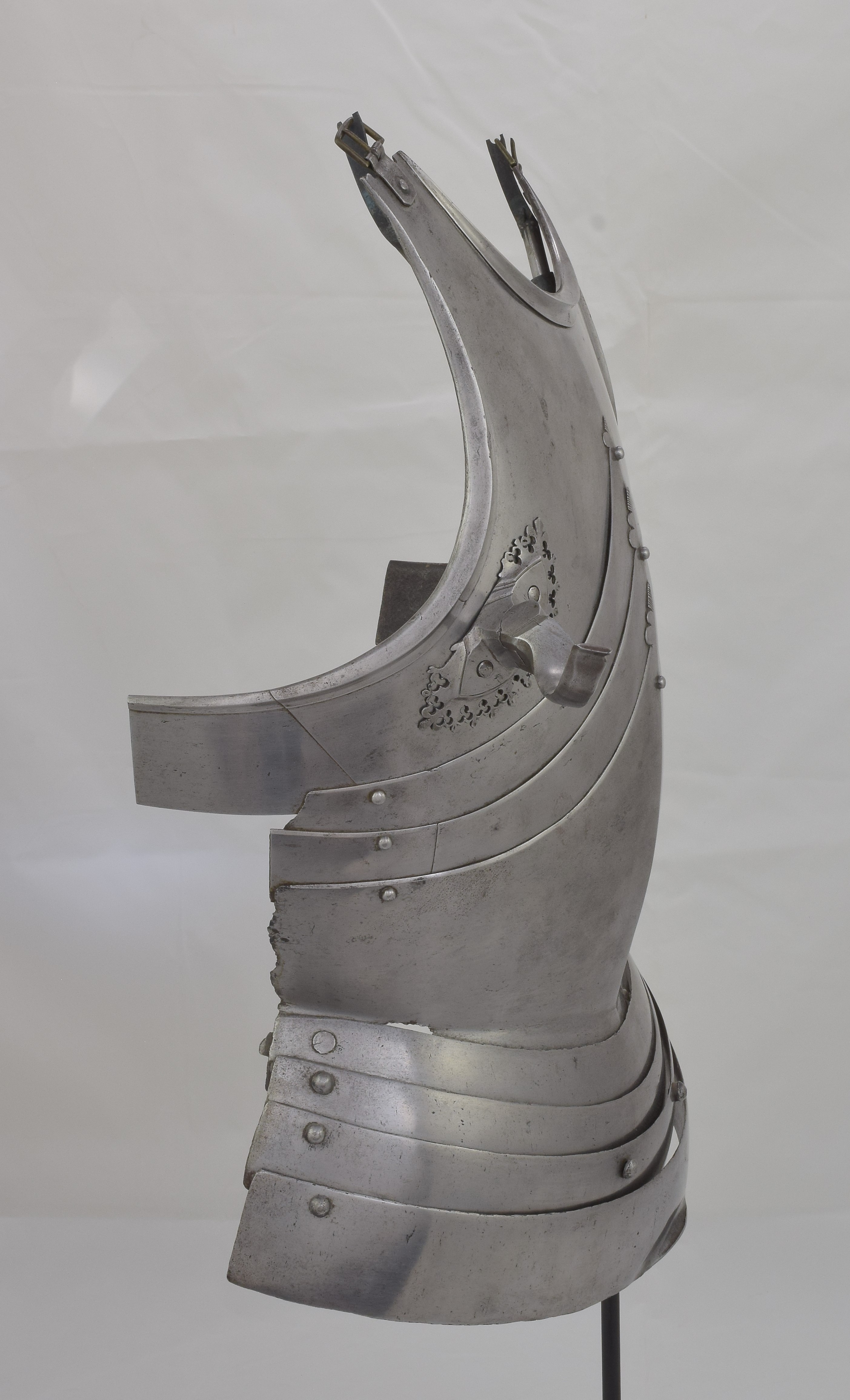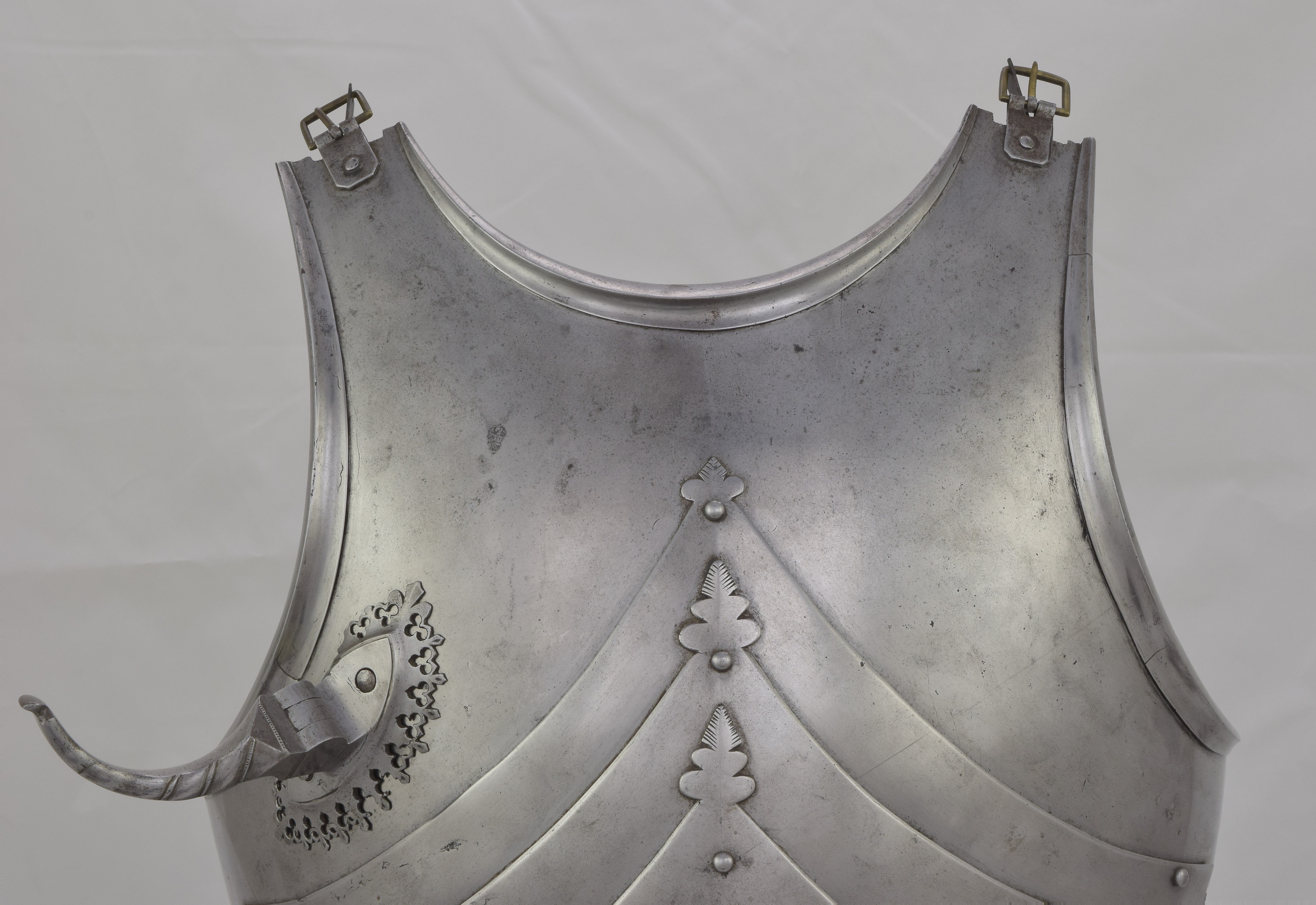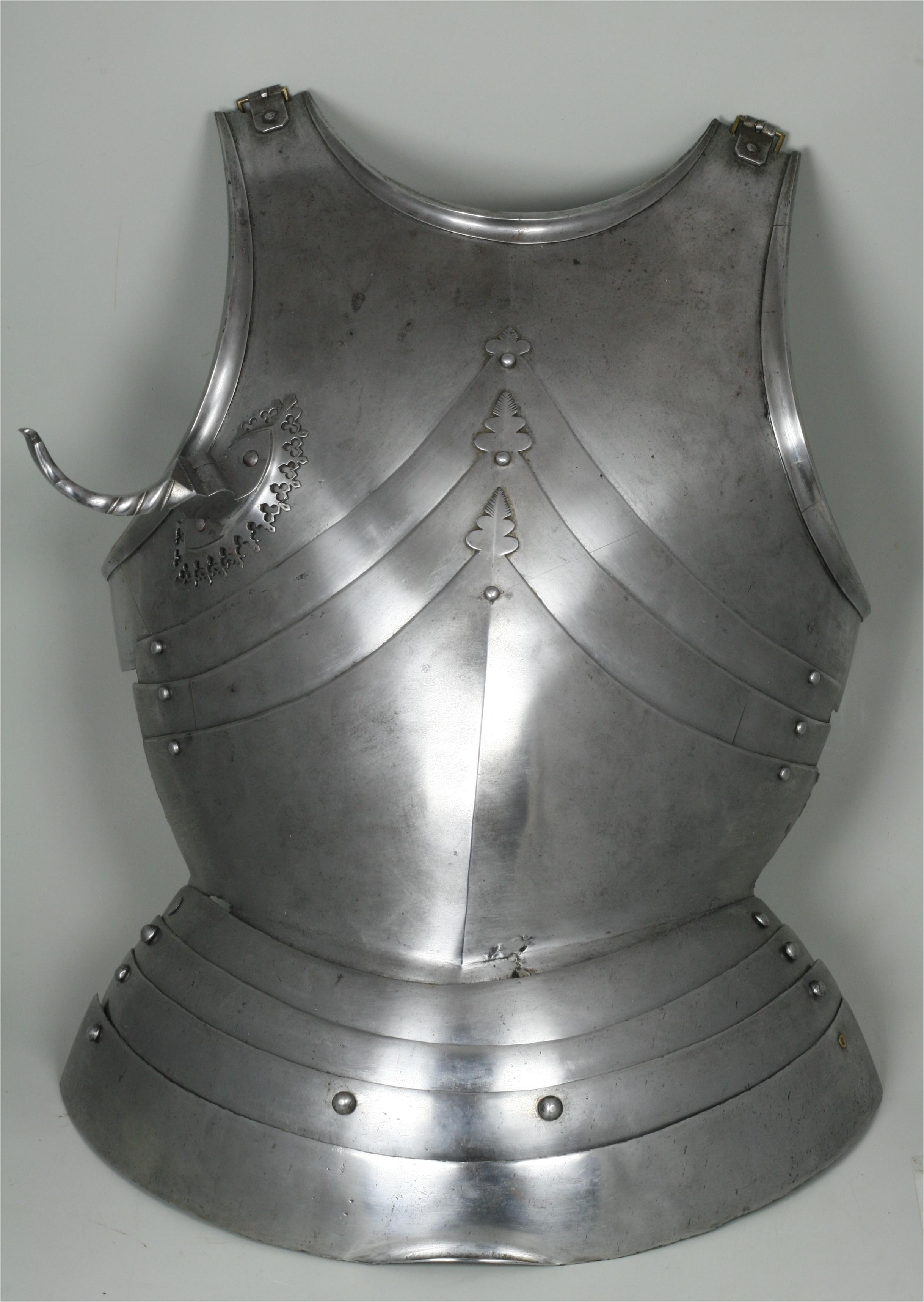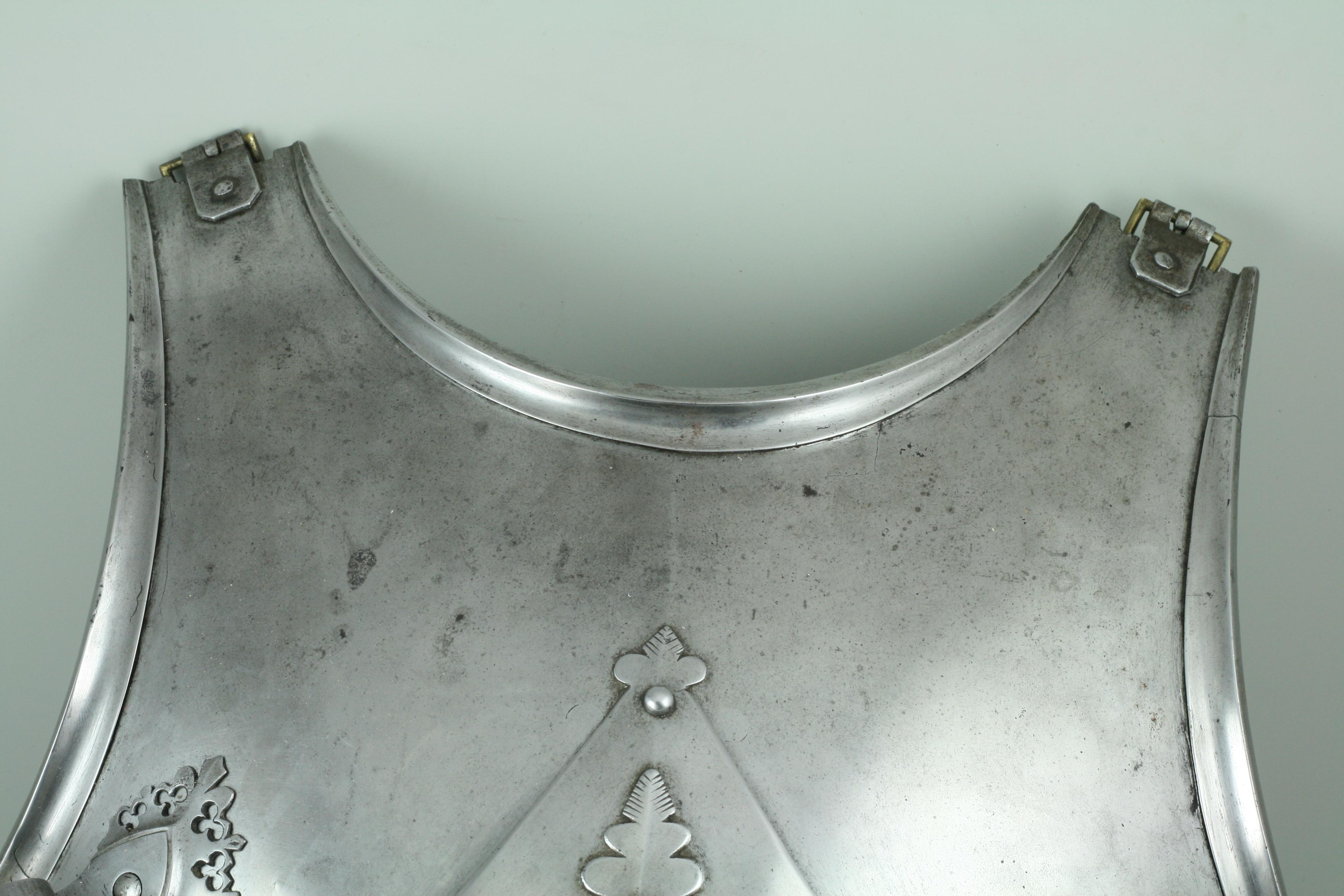 German. Composed. Upper plate with outward turned triangular rolls at the neck and arms. The form of the upper breastplate and specifically its rolls with sweeping inner curves compares very well to the Gothic armours in Vienna made by Lorenz Helmschmied. Plackart formed of one main plate and two smaller plates. Plackart associated. Plackart lames somewhat reworked to fit upper. The results aren't bad looking from the front, but the profile is far flatter than it should be and the sizes don't match - the upper is far wider than the lower plates. Some modern internal patches in original plates. One end of the upper breastplate extended to match other side. Modern fauld of four lames. Upper plate fitted with a folding lance rest secured by two bolts from he inside. Lance rest described as modern in sale description. After removal and investigation the details of construction and wear indicate that there is a possibility that the lance rest is actually of the period, possibly even originally part of the same armour as the upper breastplate. It compares very closely to those which survive on the Vienna Gothic armours of the same period. There are also similarities to the lance rest on slightly later Mantova B-8. The bolts are also similar to one of those on the Mantova armour. Two modern buckles at the shoulders. The hinges were likely originally internal, there are recesses at the ends of the shoulder extensions which have filed notch decoration. This is covered up by the current external buckle mounts.