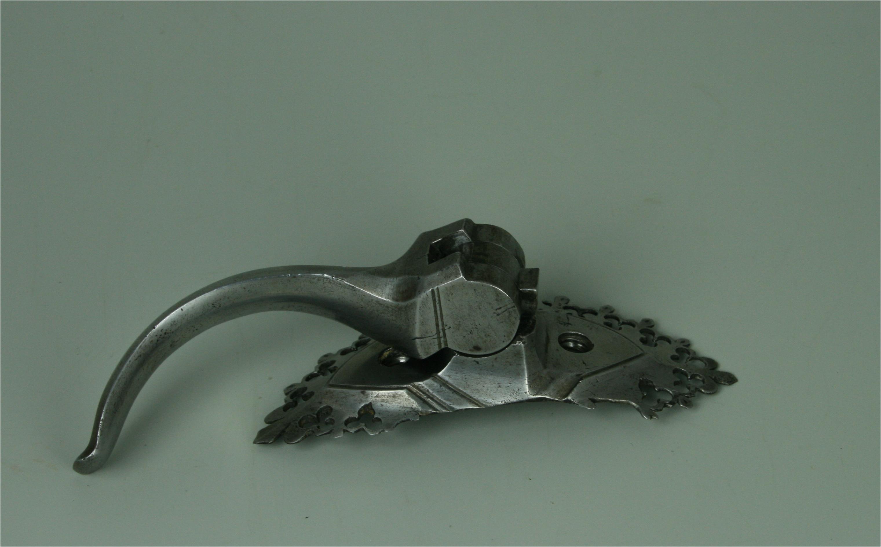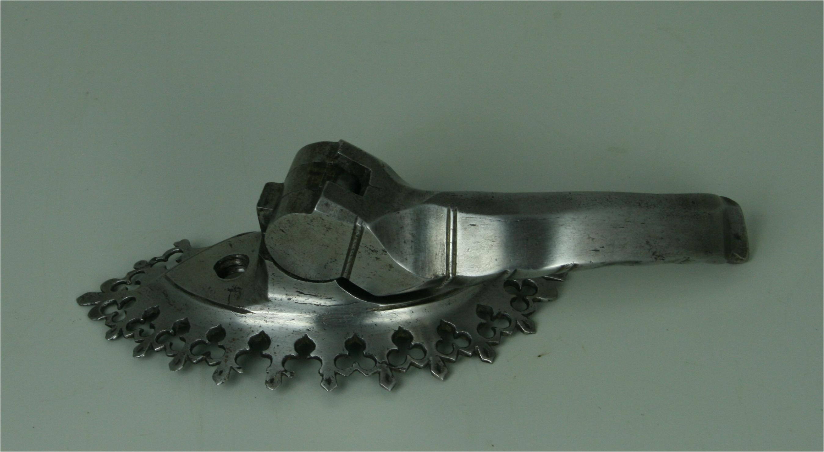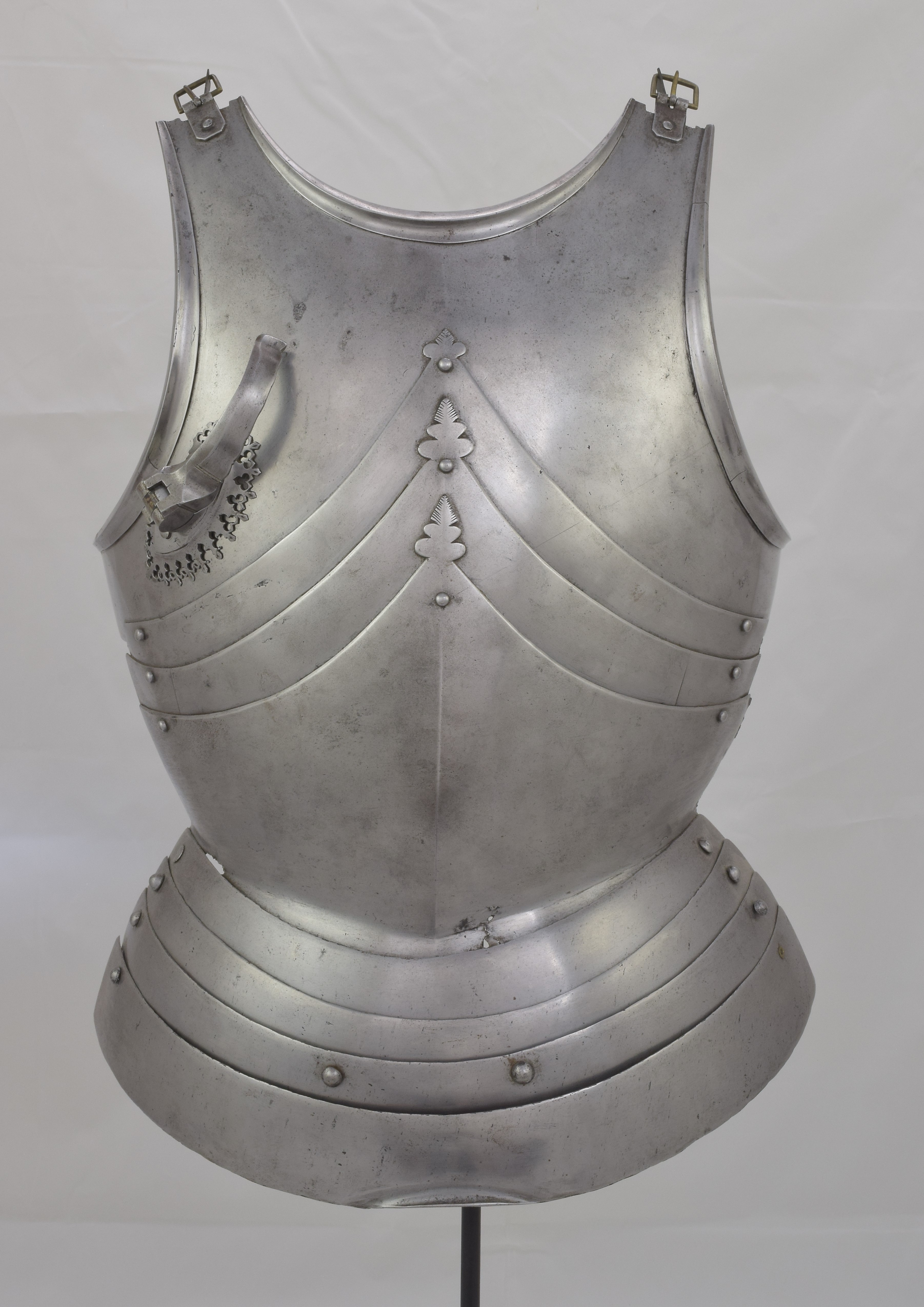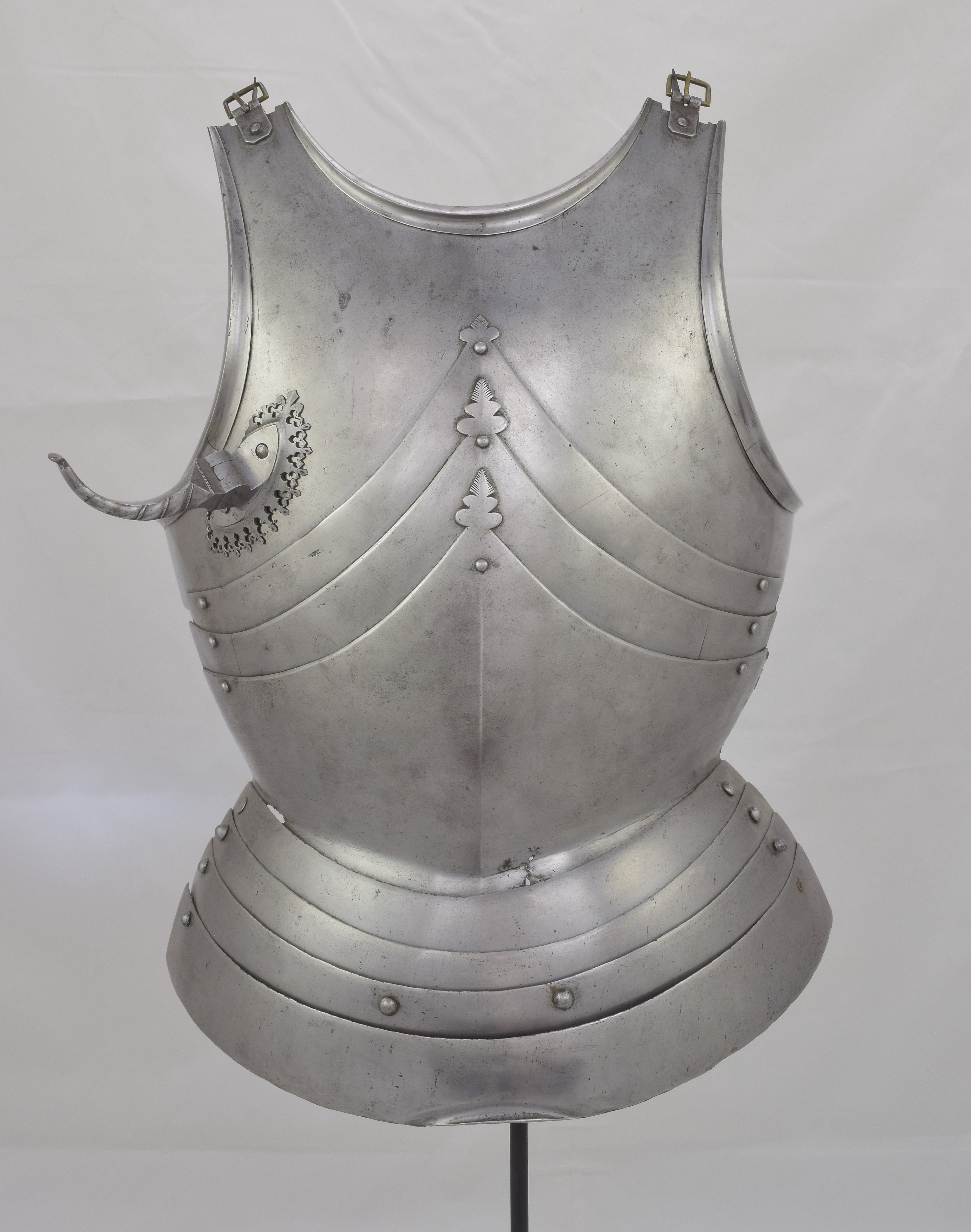 German. Composed. Upper plate with outward turned triangular rolls at the neck and arms. The form of the upper breastplate and specifically its rolls with sweeping inner curves compares very well to the Gothic armours in Vienna made by Lorenz Helmschmied. Plackart formed of one main plate and two smaller plates. Plackart associated. Plackart lames somewhat reworked to fit upper. The results aren't bad looking from the front, but the profile is far flatter than it should be and the sizes don't match - the upper is far wider than the lower plates. Some modern internal patches in original plates. One end of the upper breastplate extended to match other side. Modern fauld of four lames. Upper plate fitted with a folding lance rest secured by two bolts from he inside. Lance rest described as modern in sale description. After removal and investigation the details of construction and wear indicate that there is a possibility that the lance rest is actually of the period, possibly even originally part of the same armour as the upper breastplate. It compares very closely to those which survive on the Vienna Gothic armours of the same period. There are also similarities to the lance rest on slightly later Mantova B-8. The bolts are also similar to one of those on the Mantova armour. Two modern buckles at the shoulders. The hinges were likely originally internal, there are recesses at the ends of the shoulder extensions which have filed notch decoration. This is covered up by the current external buckle mounts.