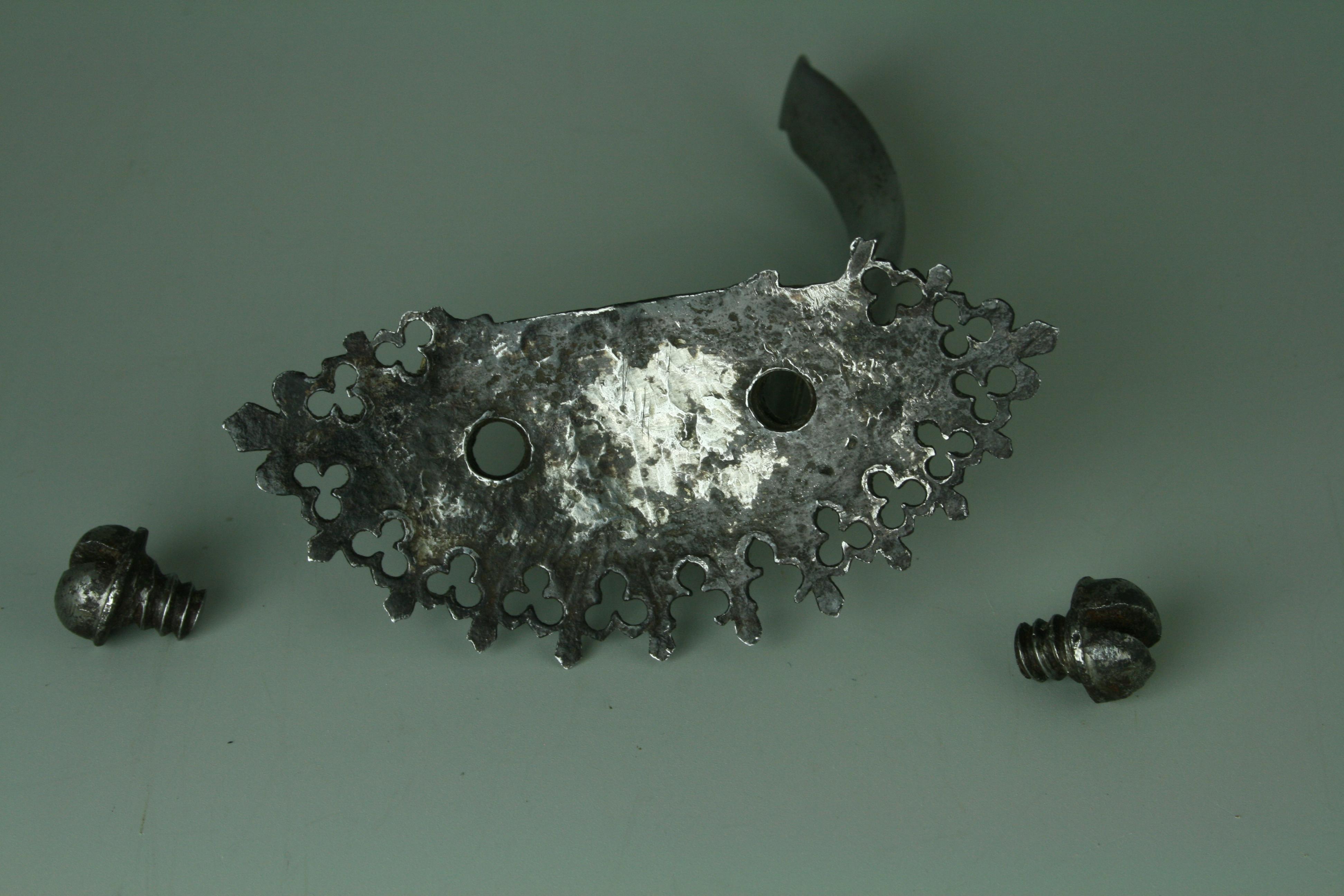 Measurements: Breastplate: 13 1/2 in tall from the base of the neck to center of waist, 11 in. wide at the shoulders, 7 1/2 in. wide at the top of the neck, 10 1/2 in. wide at the narrowest spot between the arms, 14 3/8 in. wide under the arms and 10 1/4 in. wide at the waist. Lance Rest. The hinge portion is composed of 3 parts. The central part is part of the base, the two outside elements are part of the hook. The outer two knuckles are 1/4 in. thick. The central knuckle is just over 5/16 in. thick. There isn't a clean spot where the hinge actually is a full circle. But if I measure from the top to the flat spot on the bottom, it is just over 7/8 in. tall. Top to bottom 4 1/8 in. from end of point to end of point. The base arches app 5/16 in. above the level of the 2 points at the center to allow it to fit to the curve of the breastplate. From the center of the base to the end of the hook 4 3/16 in. Width of the base from the end of a point to flat spot 1 3/4 in. Holes are app. 1 1/2 in. apart on center. Weight of the lance rest: 8.6 ounces (245g).