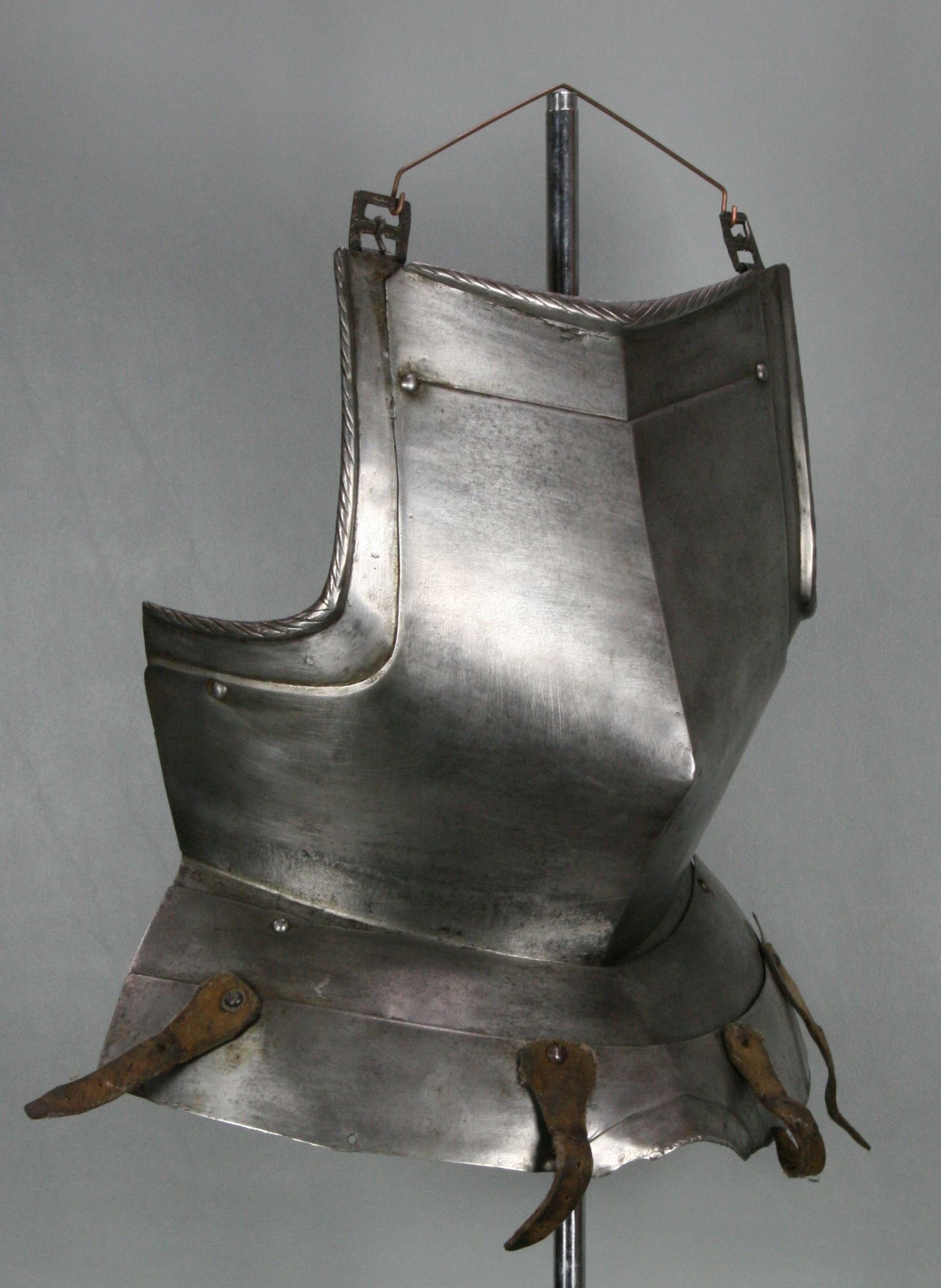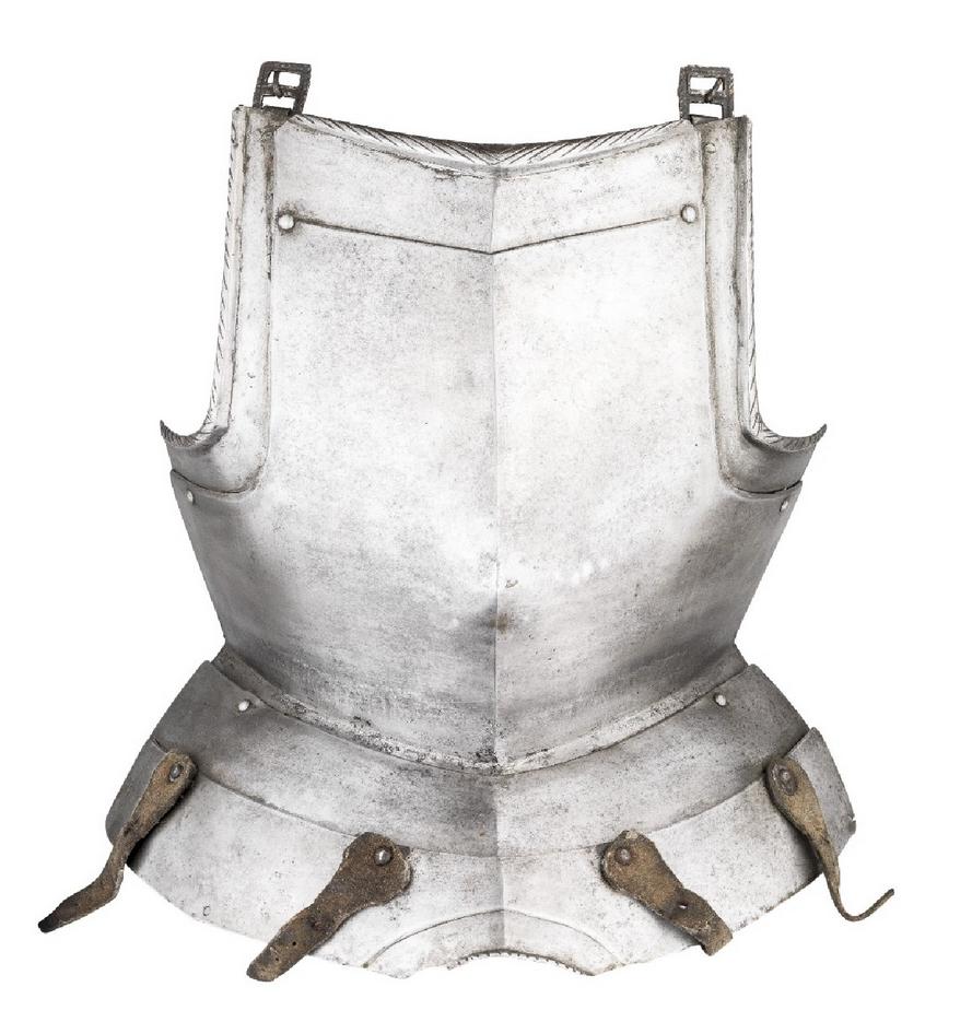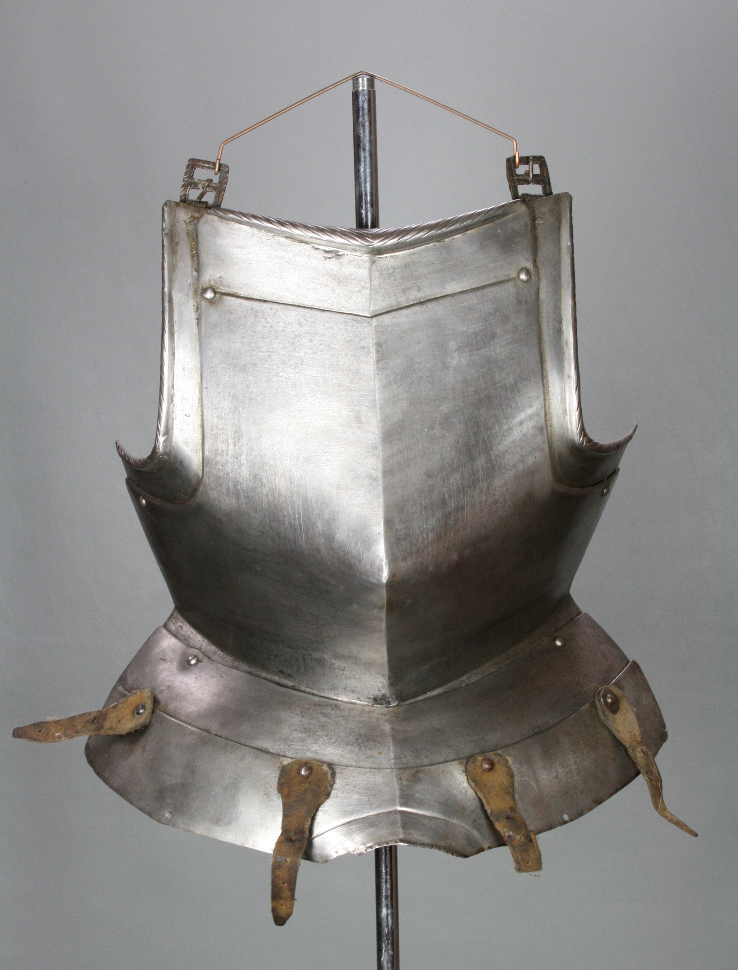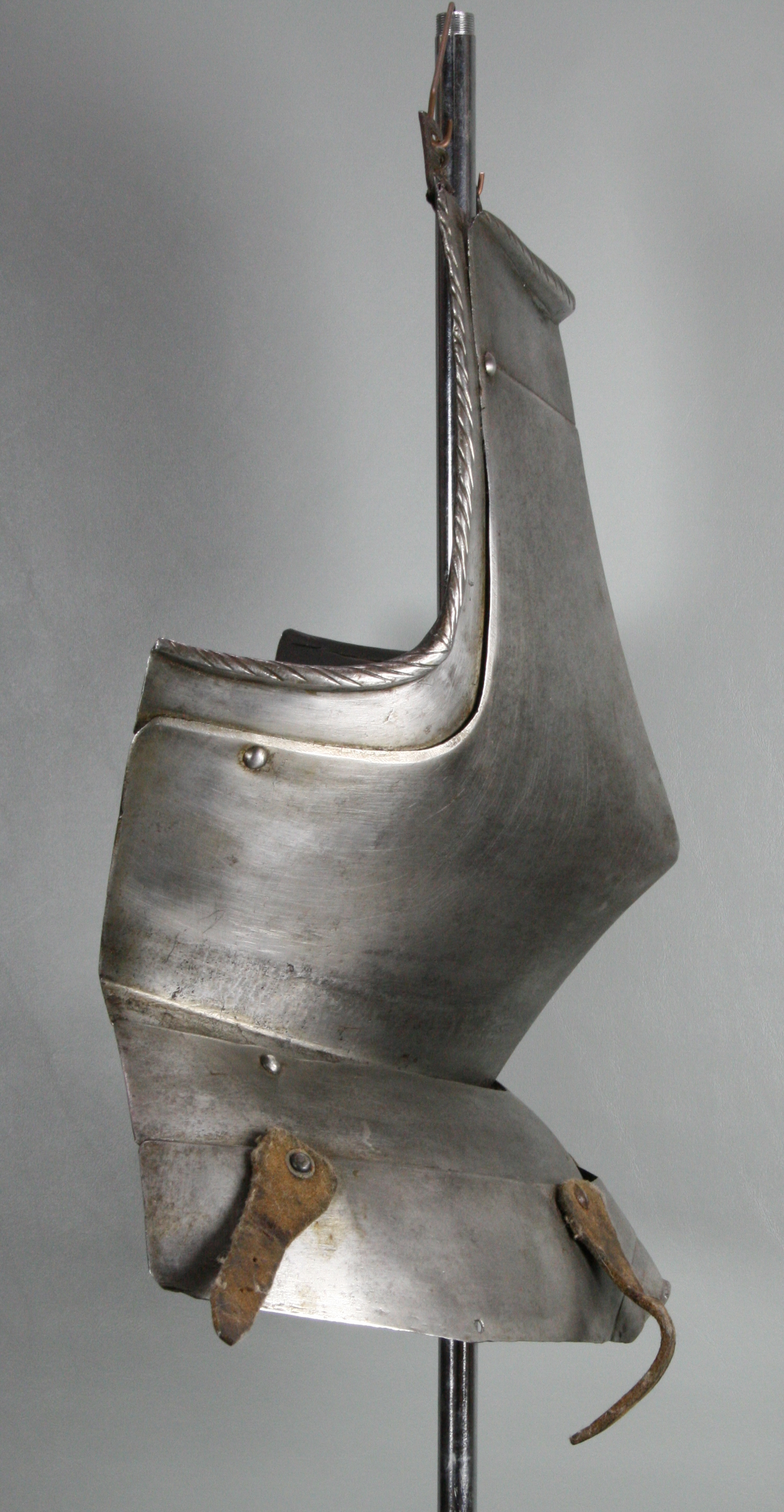 German. White. With a central crease and drawn out to a point below the center. The neck with a tapered inward turned roped roll. The arms fitted with gussets with inward turned tapered rolls. All rolls with matching roped decoration. Retains fauld of 2 plates which would extend out in the center over the crotch, forming a simplified version of the faulds where the center of the bottom lame is pushed out over the cod piece. Lower plate with 2 (probably later, but possibly working life) leather straps which may be buff for the suspension of tassets. Gussets with buckles for the shoulder straps. Interior of both fauld lames and left gusset marked with a single punch mark that appears to be the assembly mark.