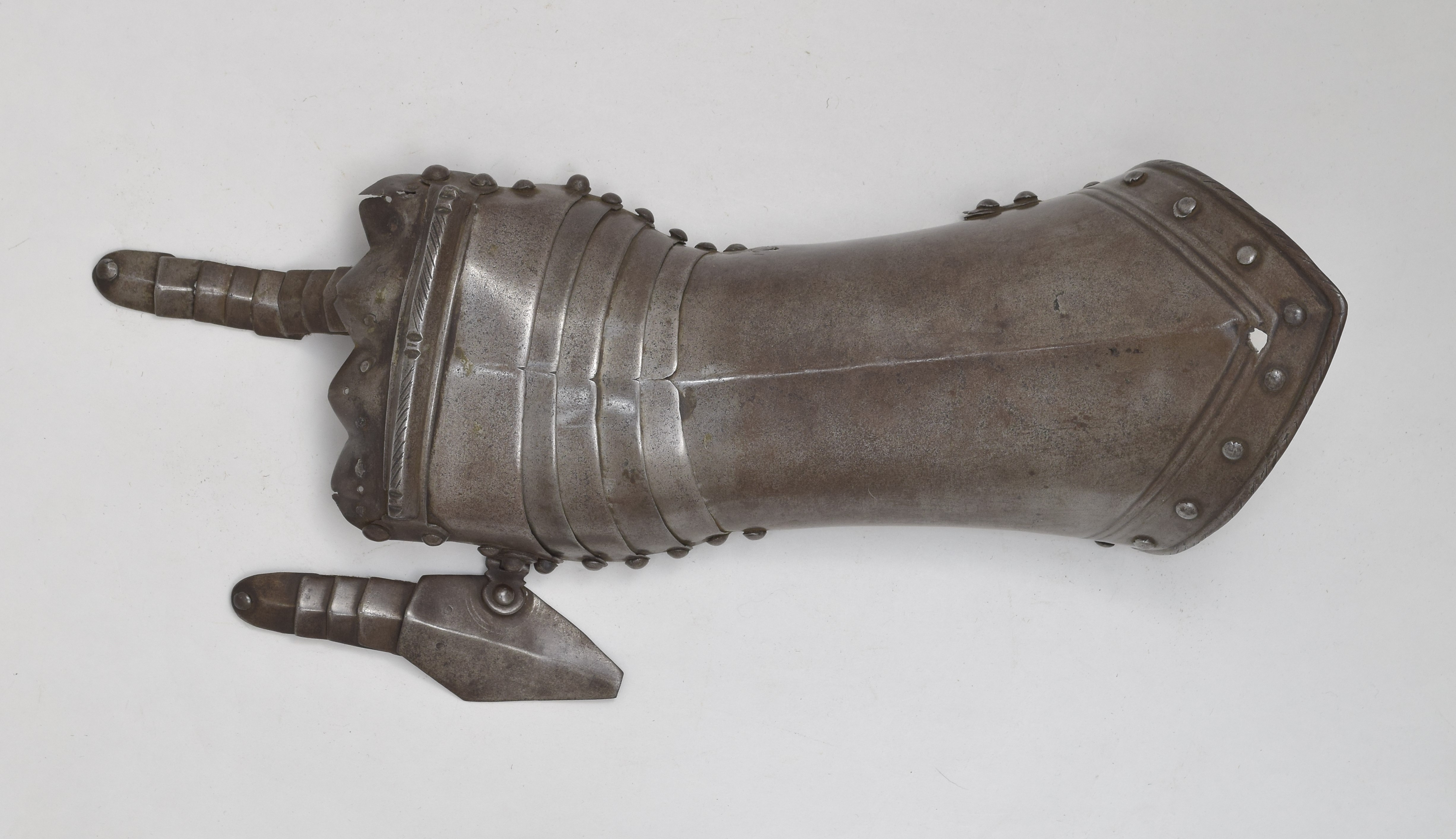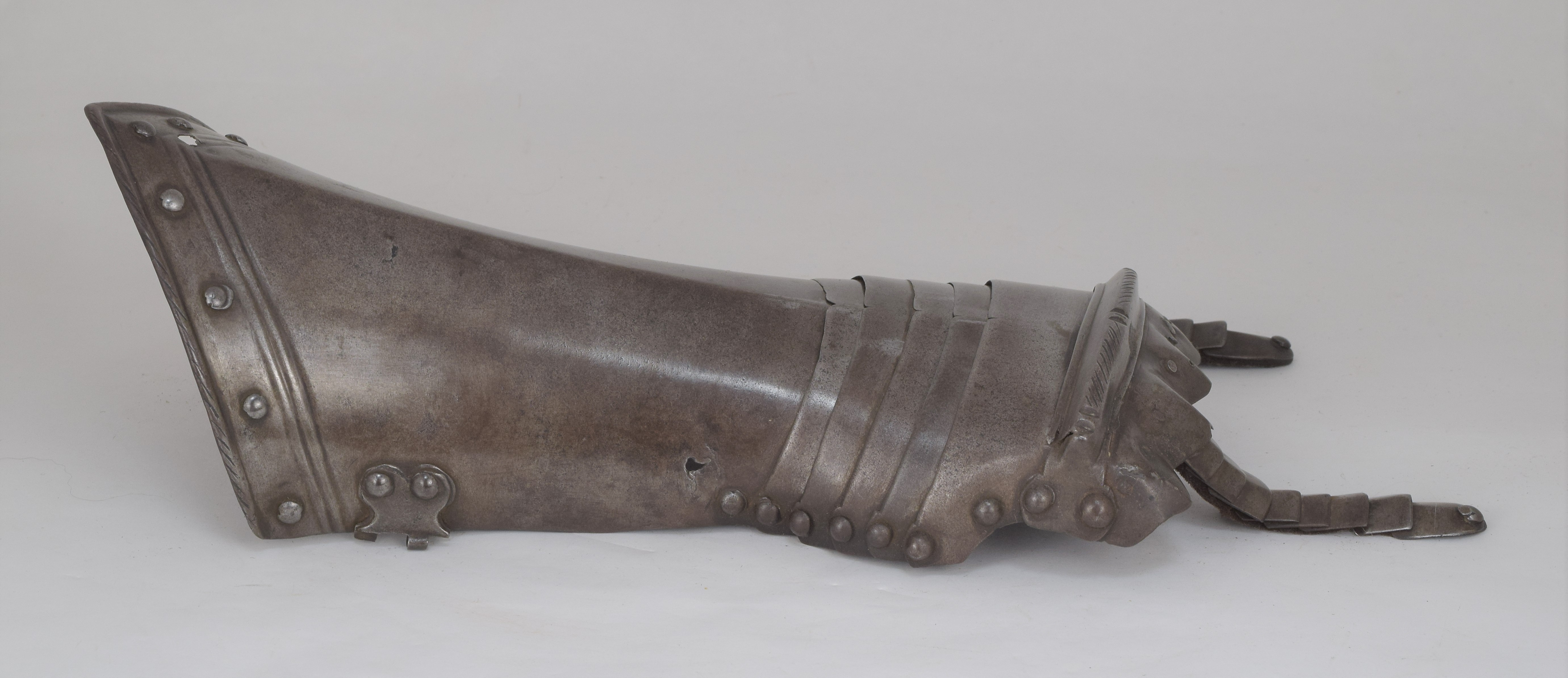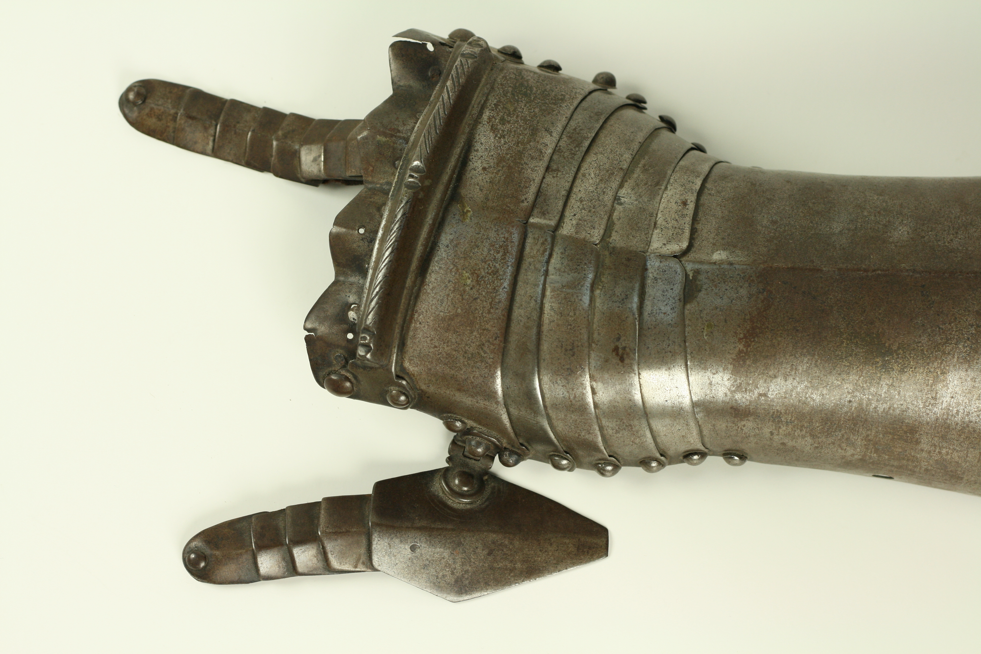 Long, pointed cuff formed with a gentle even flare over the entire length of the cuff. Central point. Border rolled and roped with an additional double row of raised decoration. Lining rivets around the edge of the cuff. Back of the hand covered by 5 articulated plates, the final plate larger than the rest. Knuckle plate decorated with a roped ridge with additional decorative grooves at the end and center. Thumb plate attached by a hinge. Fluted plate joining the knuckle plate to the fingers. One finger remaining. Interior cuff plate missing. Originally it would have been secured by a hinge on one side (half of the hinge remains) and a pin on the other side that would have engaged in the hole in the outer plate. A gauntlet of similar form with similar edge decoration is in the Keinbusch collection in Philadelphia.