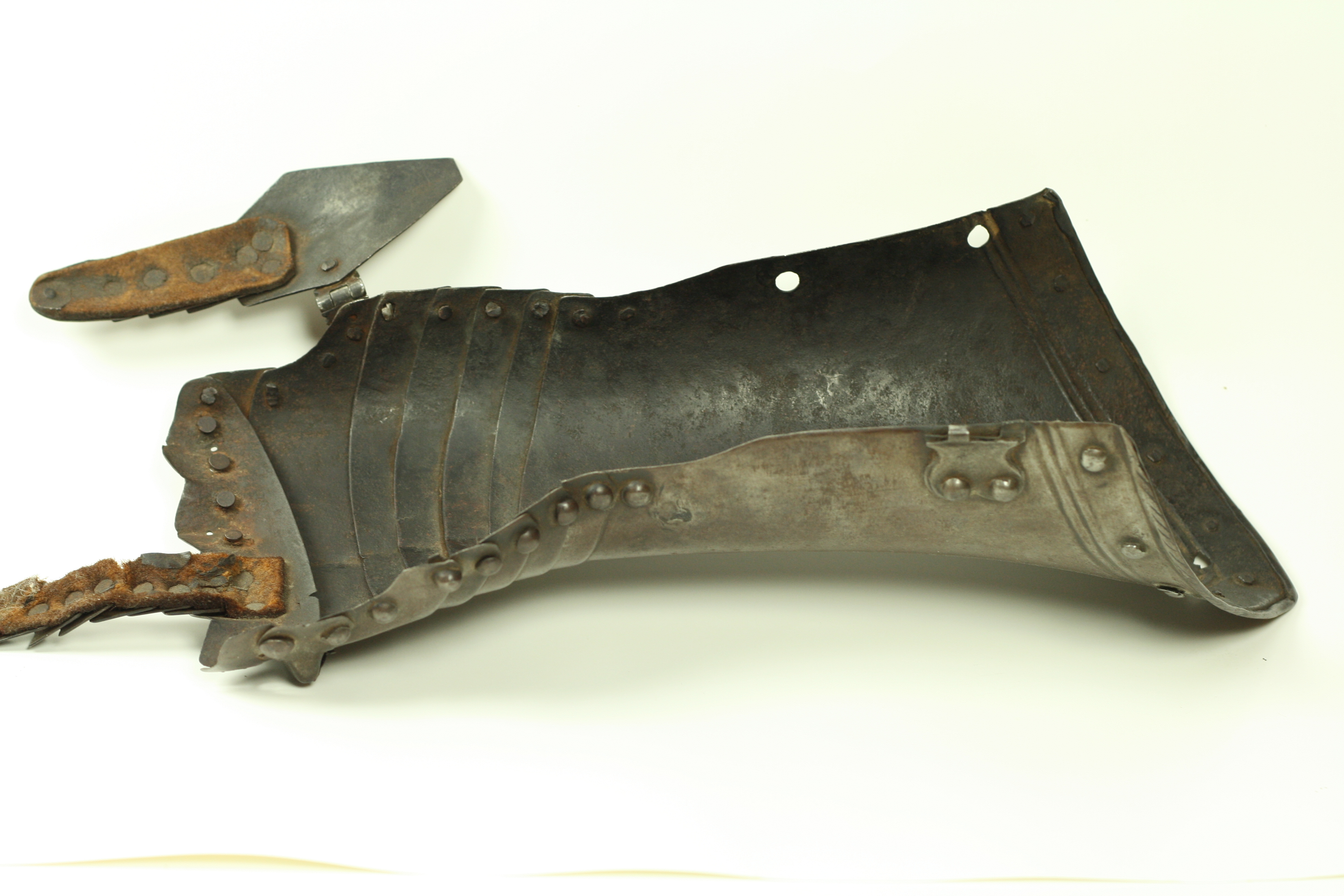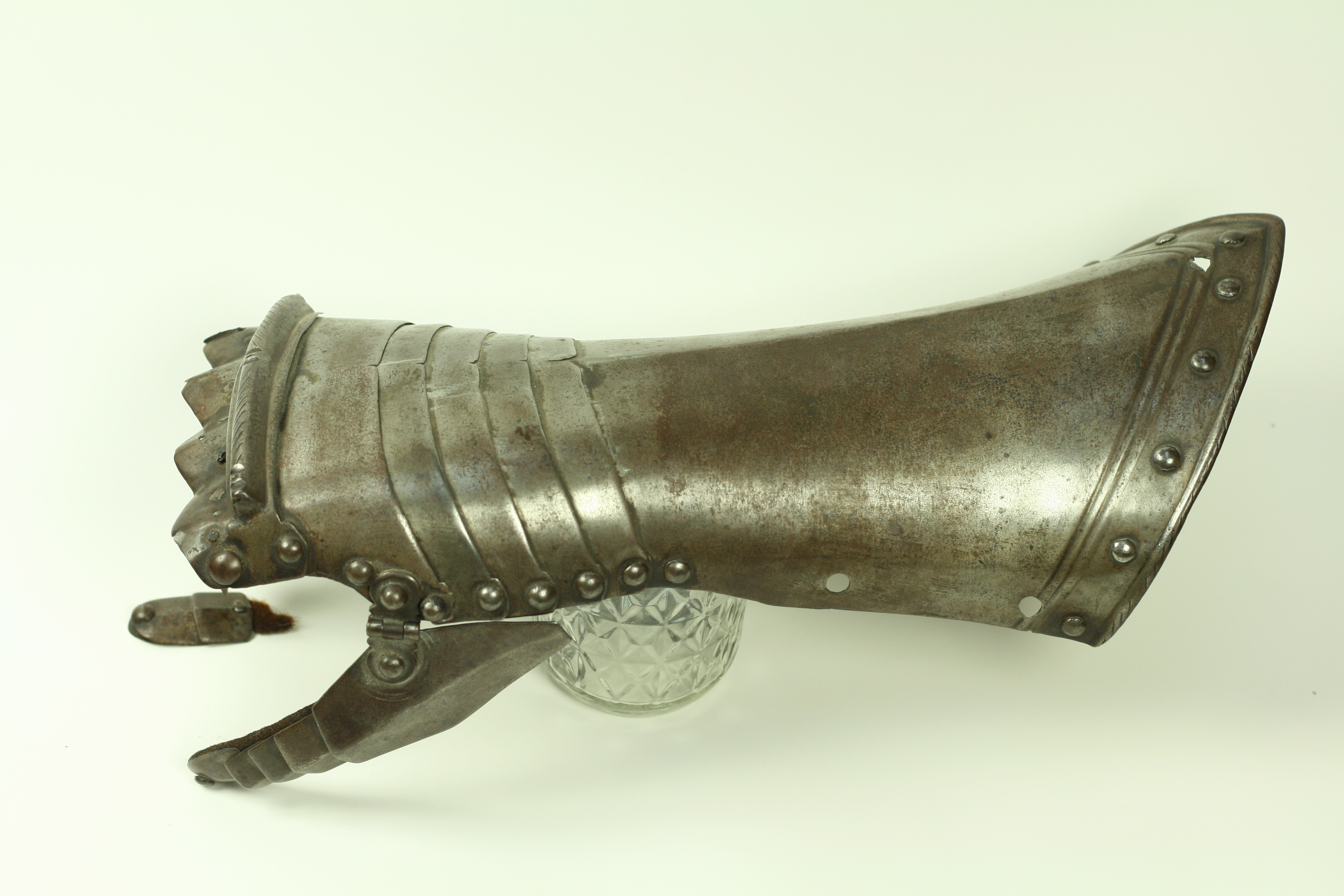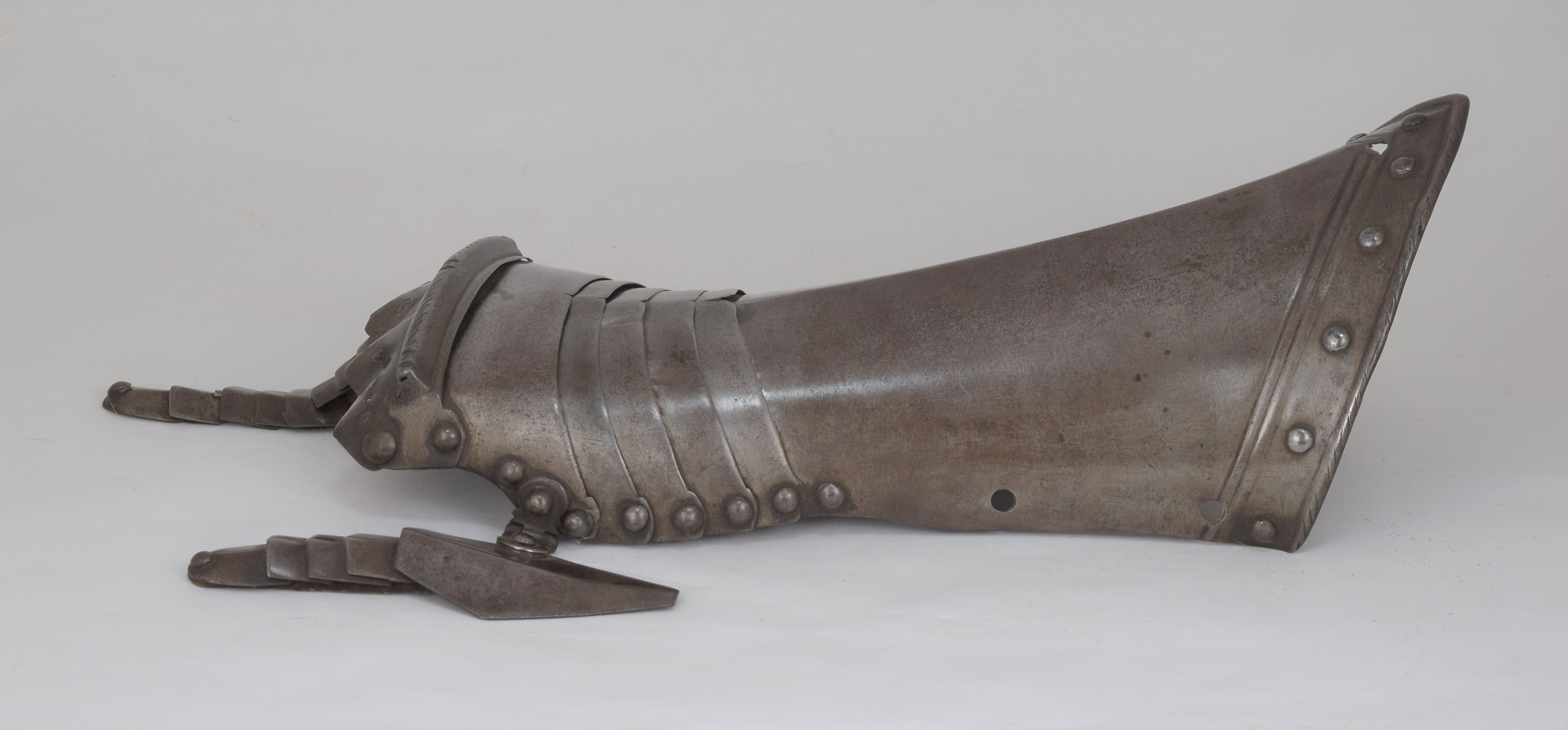 Long, pointed cuff formed with a gentle even flare over the entire length of the cuff. Central point. Border rolled and roped with an additional double row of raised decoration. Lining rivets around the edge of the cuff. Back of the hand covered by 5 articulated plates, the final plate larger than the rest. Knuckle plate decorated with a roped ridge with additional decorative grooves at the end and center. Thumb plate attached by a hinge. Fluted plate joining the knuckle plate to the fingers. One finger remaining. Interior cuff plate missing. Originally it would have been secured by a hinge on one side (half of the hinge remains) and a pin on the other side that would have engaged in the hole in the outer plate. A gauntlet of similar form with similar edge decoration is in the Keinbusch collection in Philadelphia.