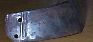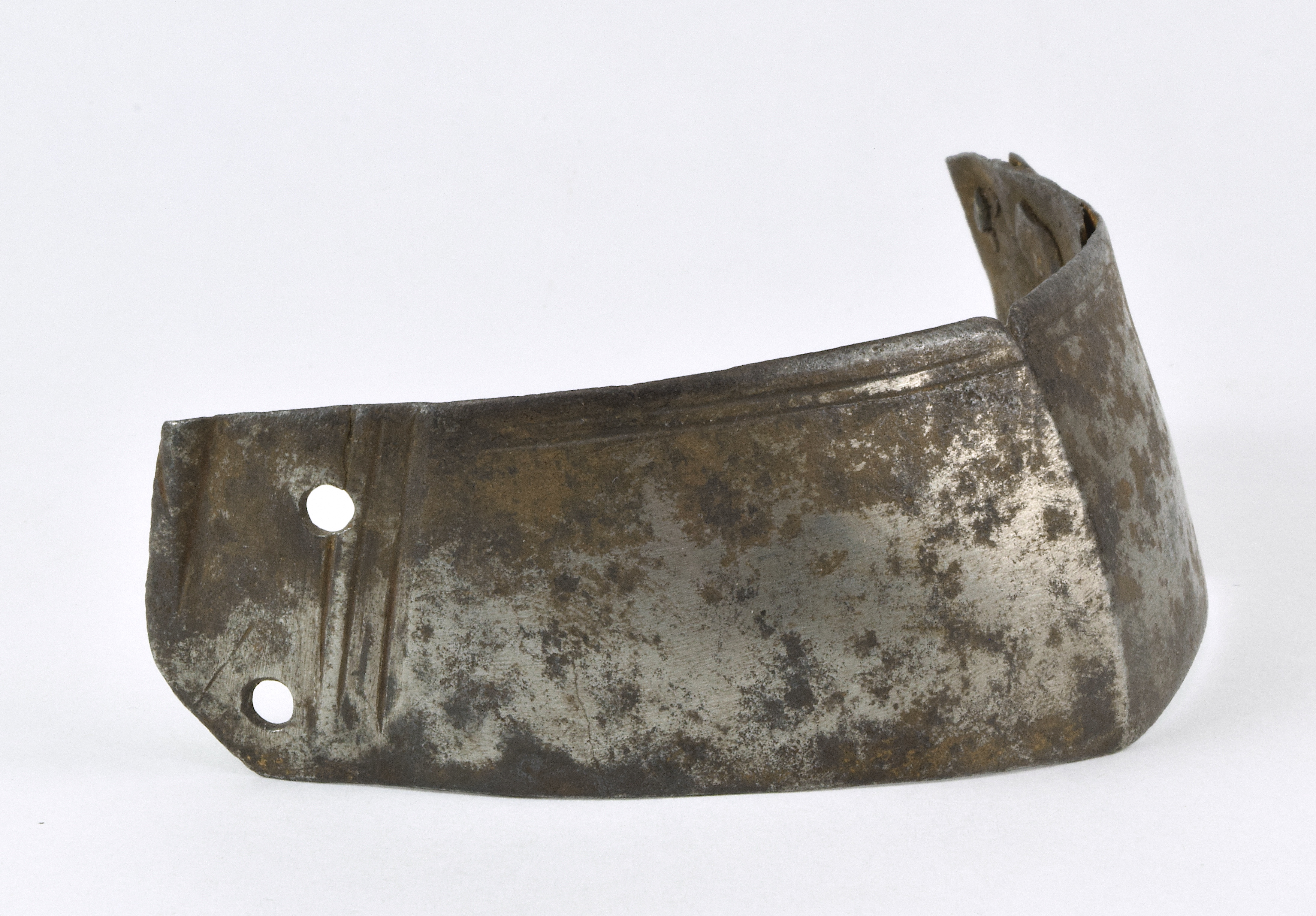 Central crease with filed notch decoration at crease, double incised lines at top, rolled and roped edge with recessed decoration border at one end. Border includes an additional raised line. Old crude patch and 1 remaining brass-headed rivet on the other end.