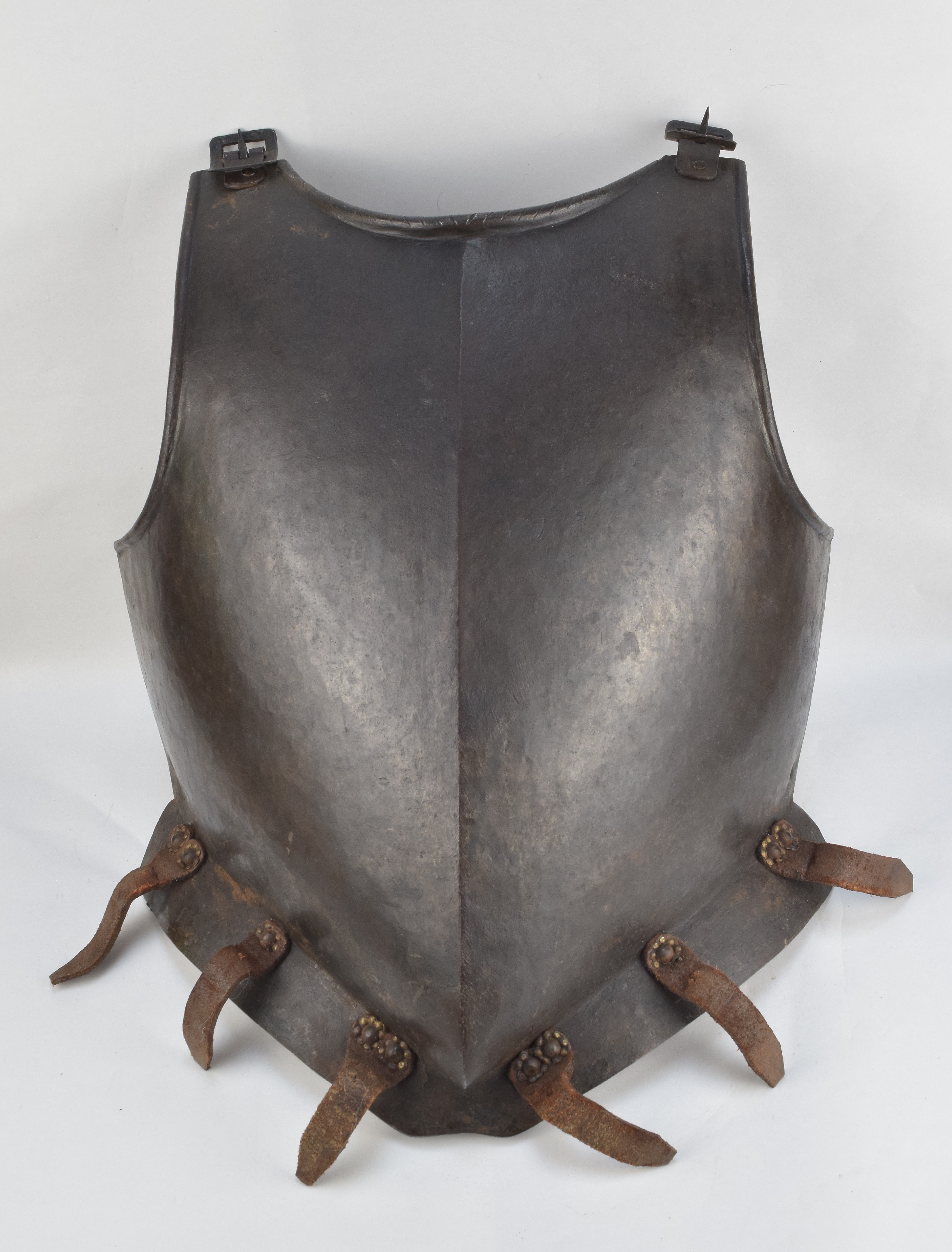 Central crease ending in a well formed peascod point at the center of the waist. Inward turned and tapered file roped border at the neck with plain inward turned rolls at the armholes. Flared at the waist to carry tassets. Buckles at the shoulders to secure it to the backplate and three straps on each side of the waist flare to carry the tassets. Tasset straps secured with iron rivets and copper alloy rosette washers. Surface rough from the hammer with (likely) later blackened finish. The finish isn't just modern paint. It is at places brown and semi-transparent. This may be an older linseed oil based finish. The buckles and straps are well done, but they appear to be modern. Interior marked with 'IX' matching the mark on the backplate.