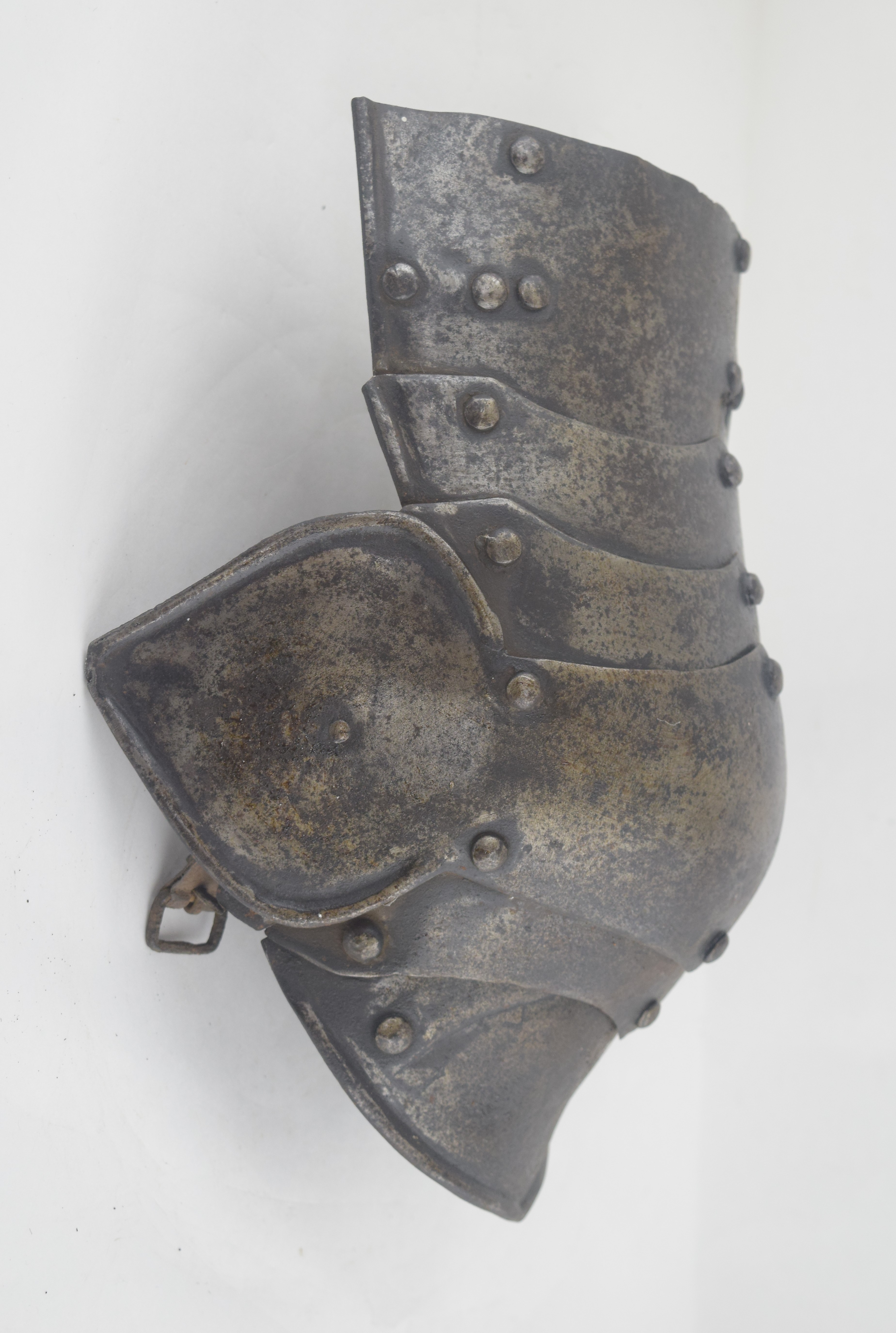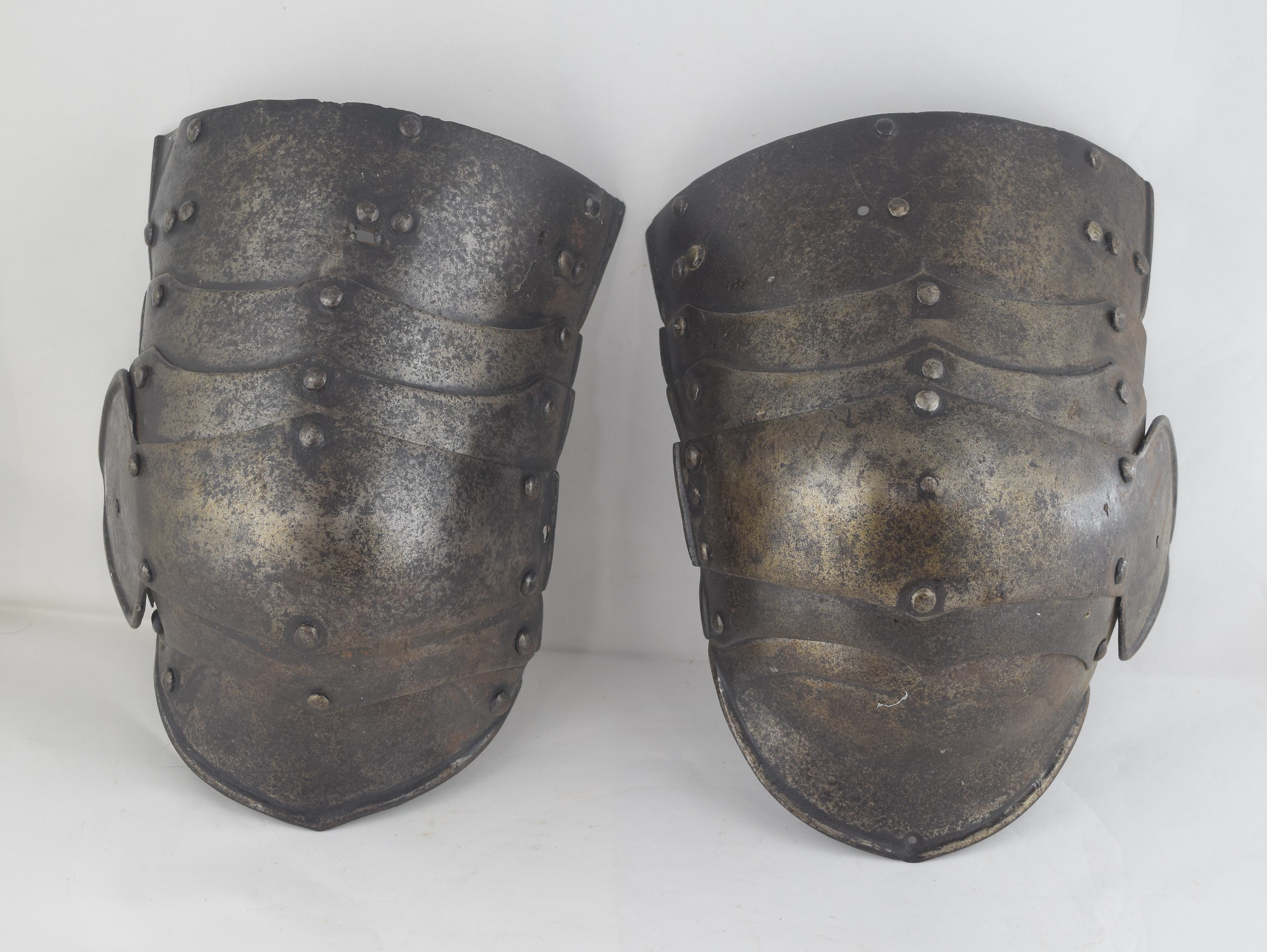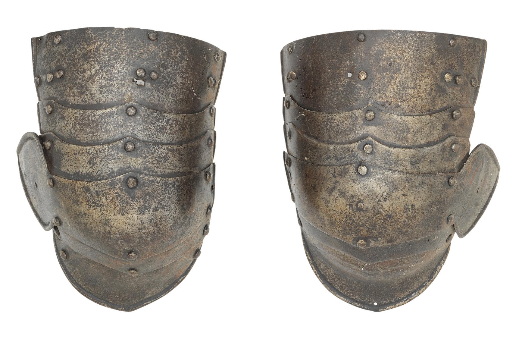 Forming a pair. Each consisting of a central plate formed to the knee and extending to a wing at the lateral side. Overlapping two lames top and one lame bottom. Top with an additional large plate. Bottom with an additional plate. Edges with plain inward turned rolls. Decorated with rivets at the center of the plates. Other similar items include item number A-22, item number A-155 and complete tassets item number A-331-f.