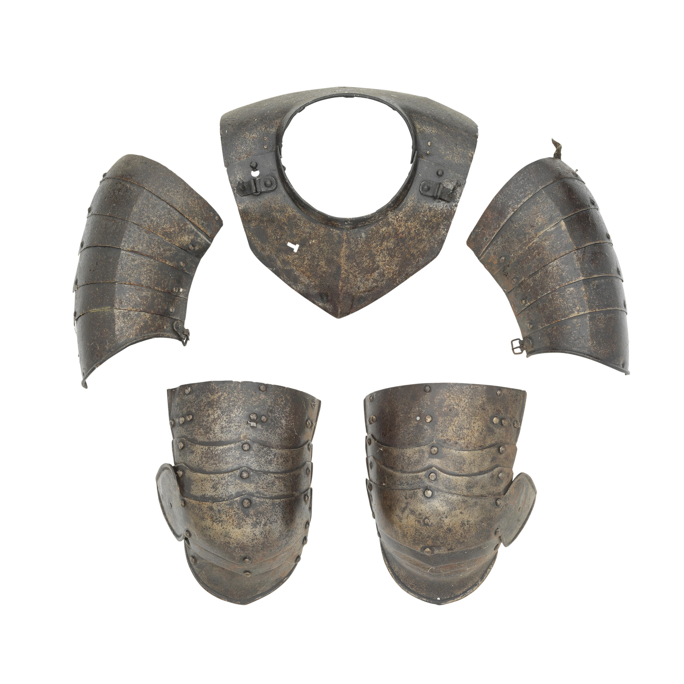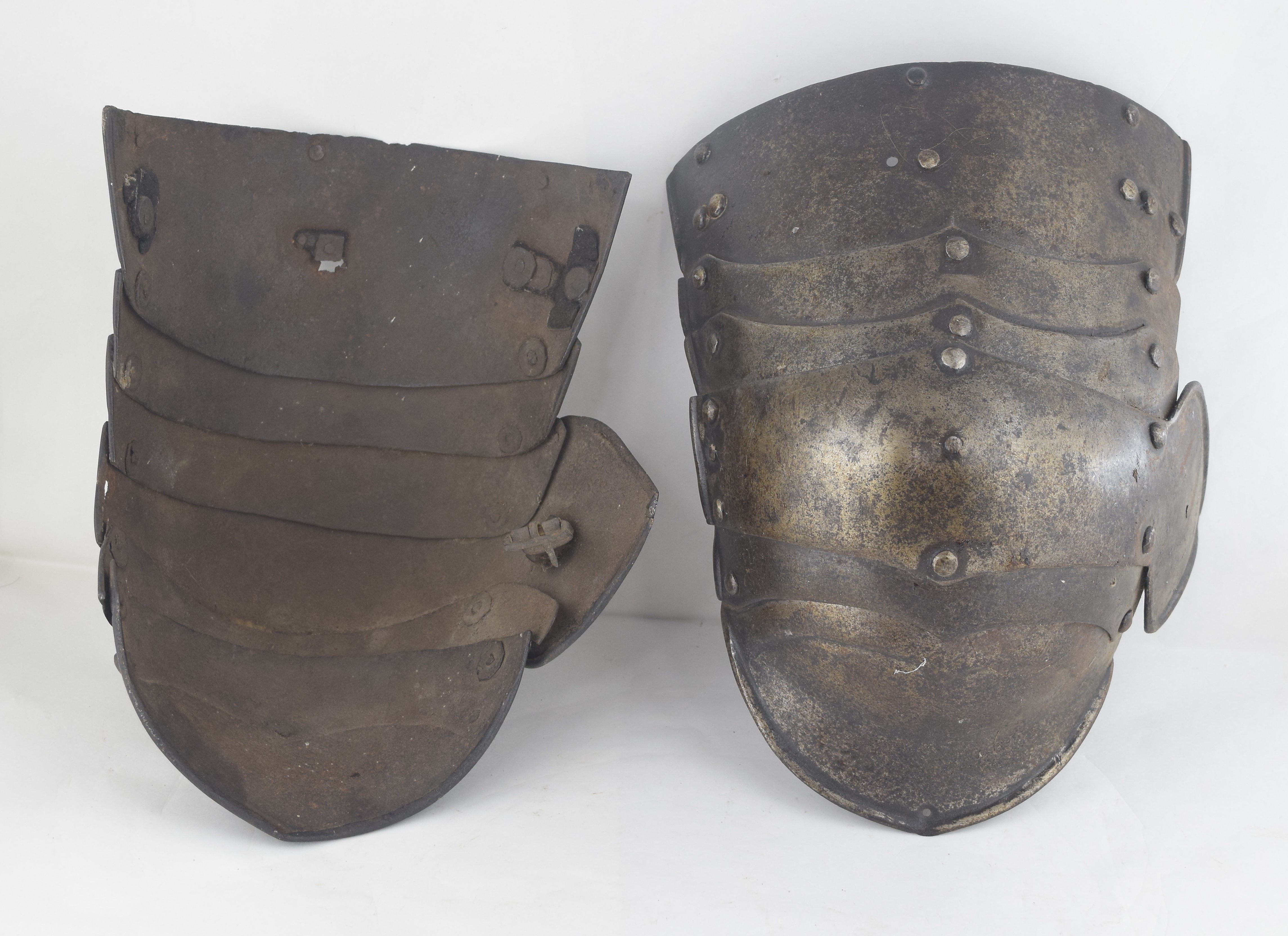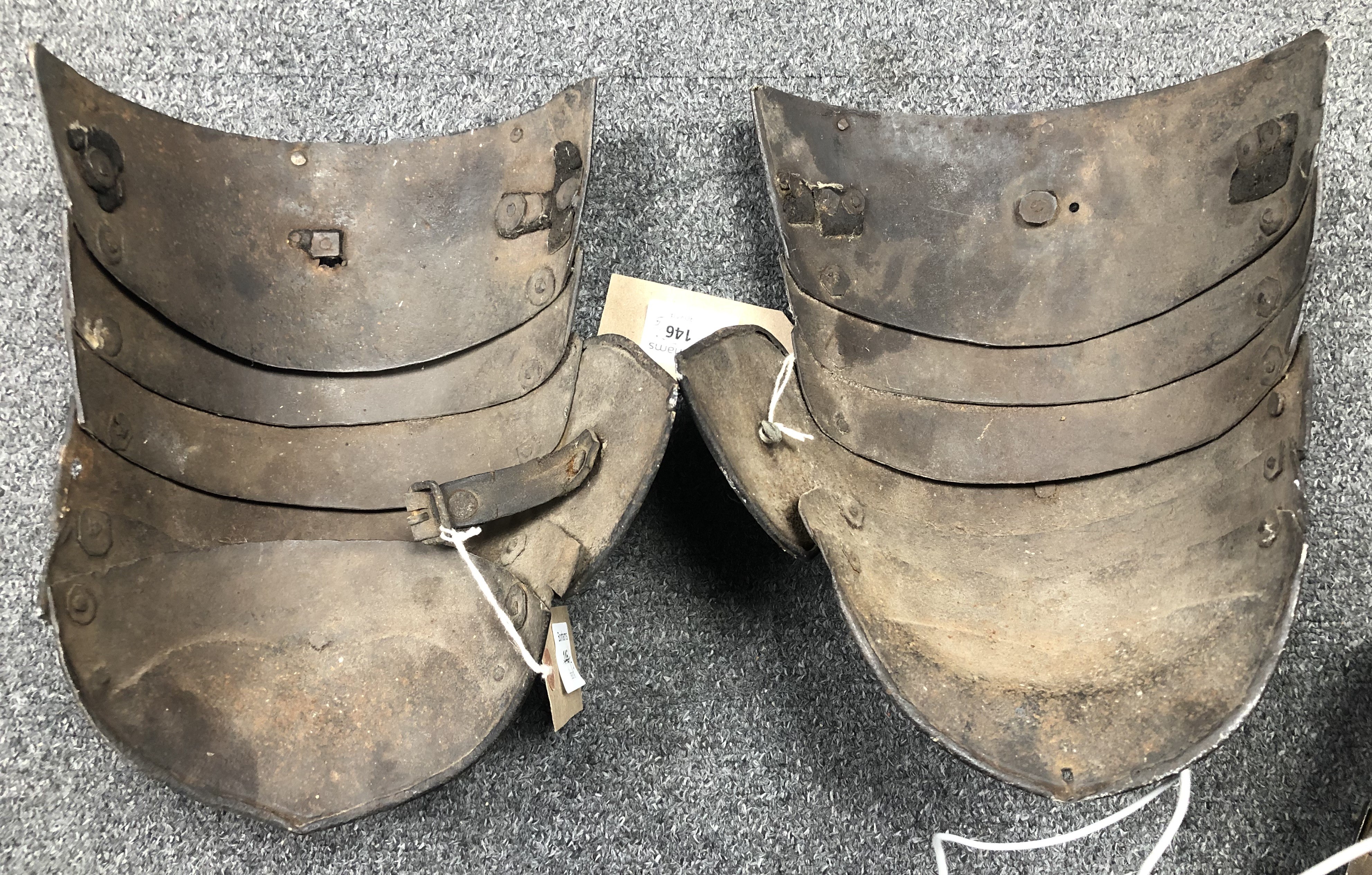 Forming a pair. Each consisting of a central plate formed to the knee and extending to a wing at the lateral side. Overlapping two lames top and one lame bottom. Top with an additional large plate. Bottom with an additional plate. Edges with plain inward turned rolls. Decorated with rivets at the center of the plates. Other similar items include item number A-22, item number A-155 and complete tassets item number A-331-f.