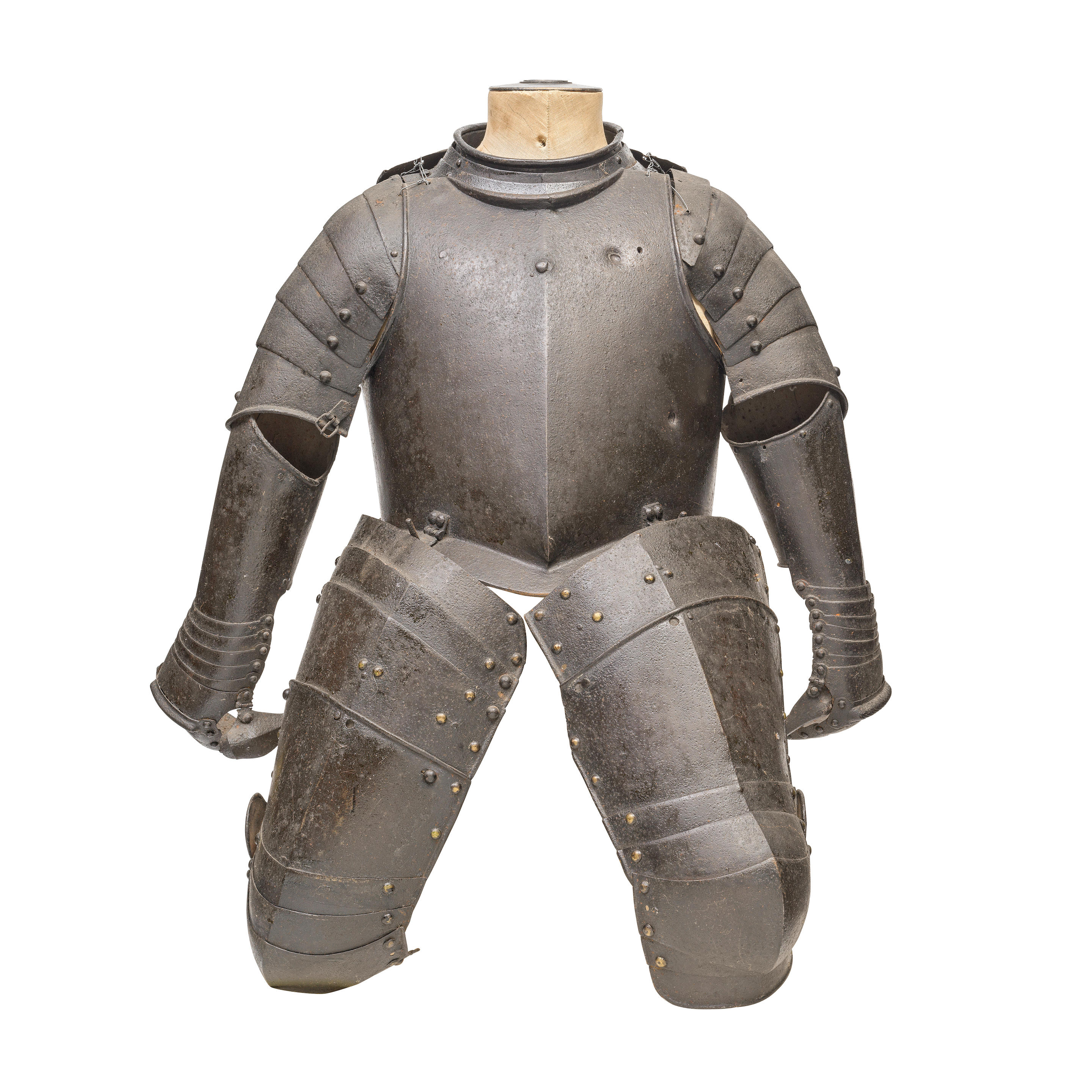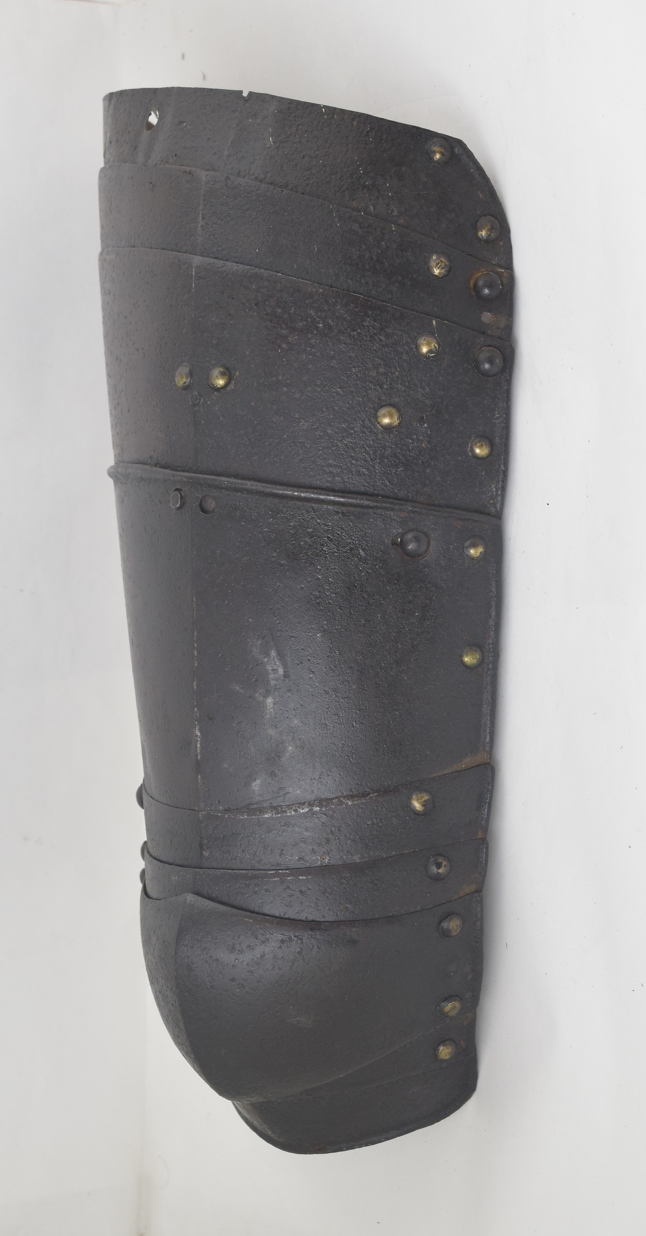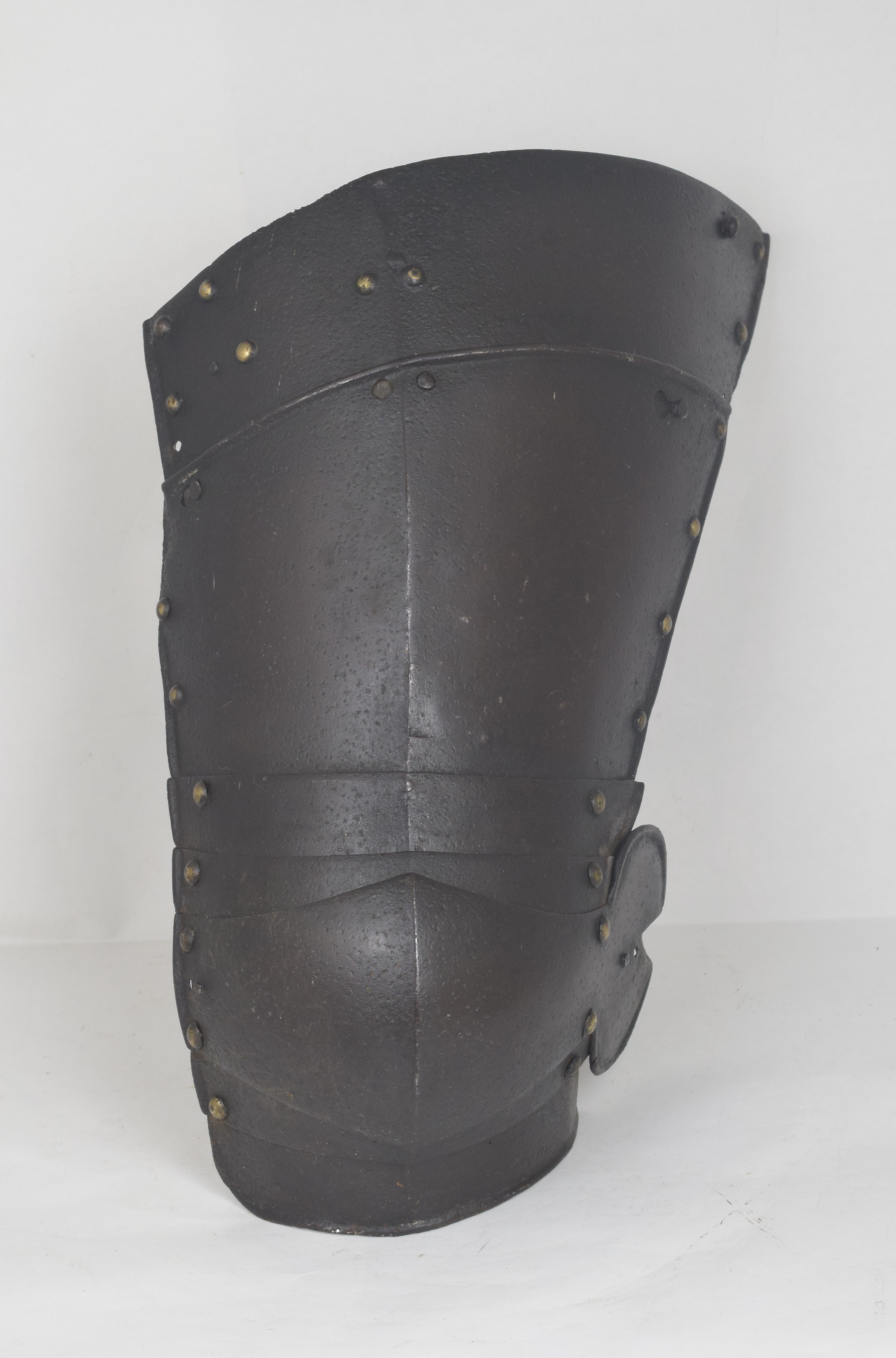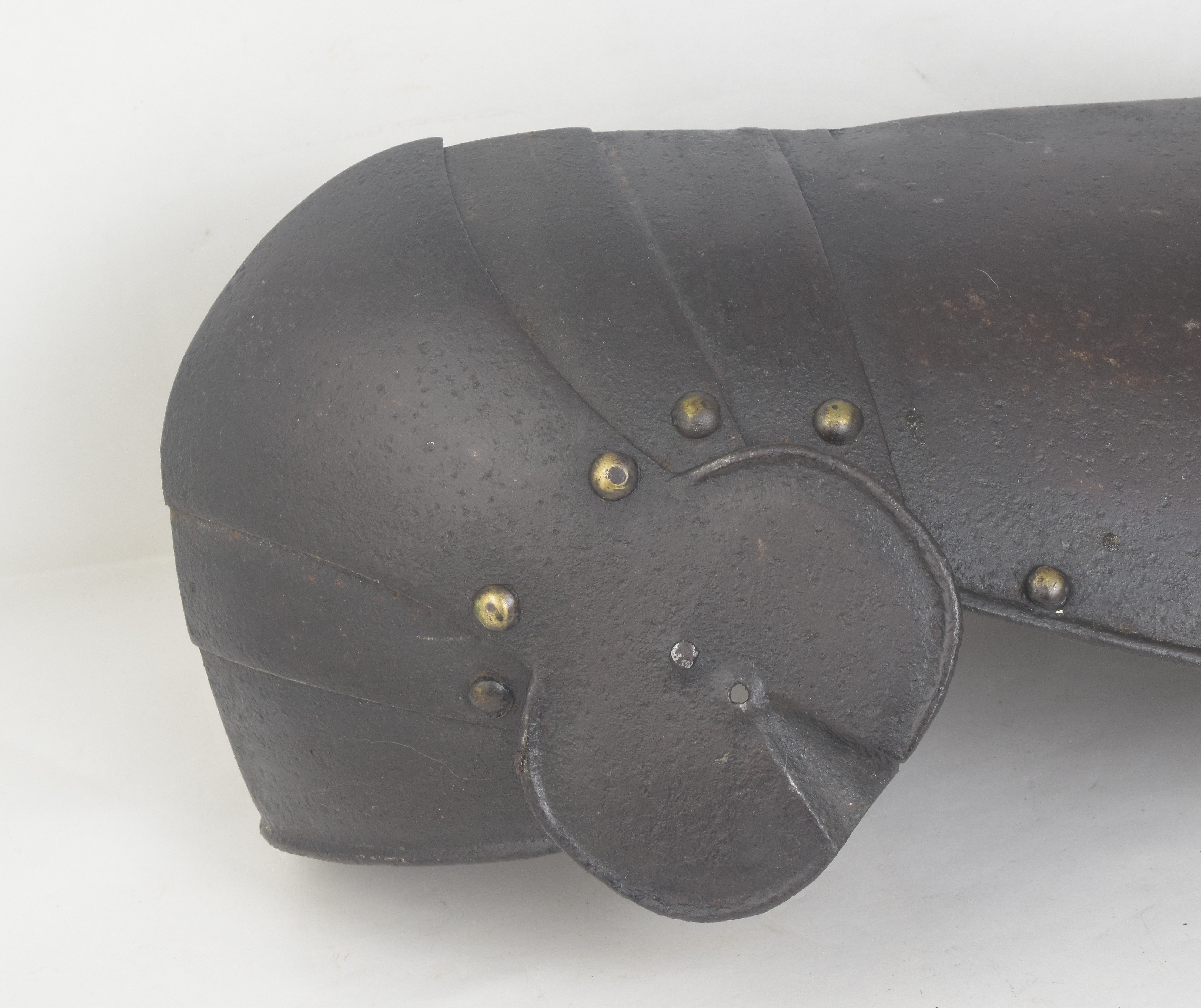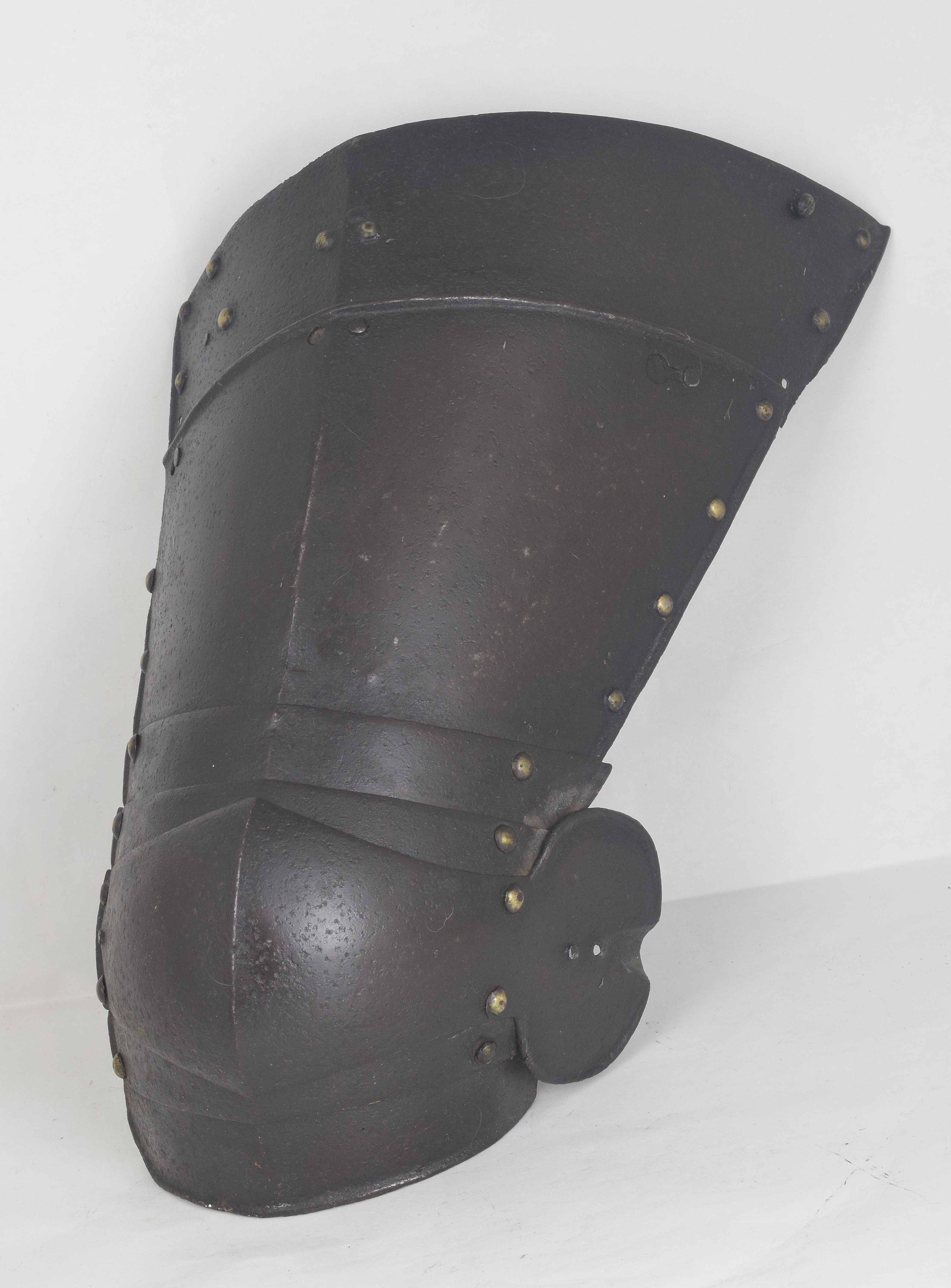 Augsburg. Typical of the form of well made armors. Not a pair, but of the same style. In each case with a polyene of five plates the third overlapping the others. Central plate formed to the knee and extended at the lateral edge to a wing. Cuisses of four (right) and two (left - top plates missing,top remaining one associated) plates. Cuisse separates between the bottom and next plate. Most rivets with dapped copper alloy caps. Inward turned full rolls stepped where plates overlap on the primary edges. Roll at the edge of the wings with a tapered recess. Each wing with with a central cusp. Upper cuisse plates originally secured with sliding rivets laterally and leathers at the center and medial edge. Rivets also remain for a narrower leather around the outer edge of the cuisse. The main cuisse plate and first lame of the poleyene also have rivets for an internal central leather. Sections of the cuisses formerly secured by a button engaging a keyhole slot at the lateral side, two holes at the center of the lower plate which can be used as lace holes when the cuisses are worn short. When they are worn with the uppers, a pin on the upper plate engages the lateral hole. The medial side was secured with a turning pin on the upper plate engaging a keyhole in the lower plate. When tassets can be separated, the upper sections can be worn without the lower sections, so they have rolled lower edges. Upper cuisses are not worn without the lowers, so the lower edge of the upper cuisses are not rolled.