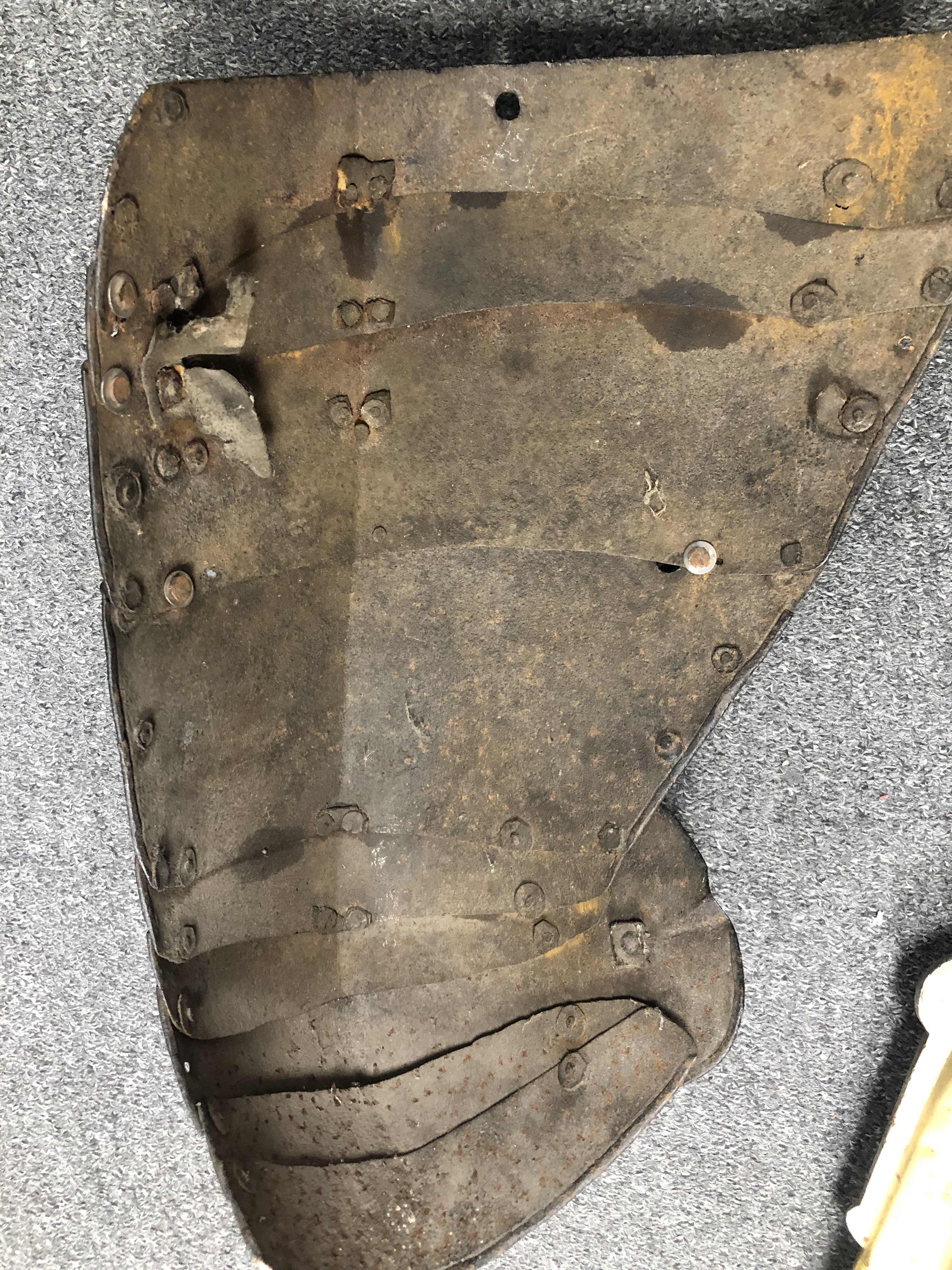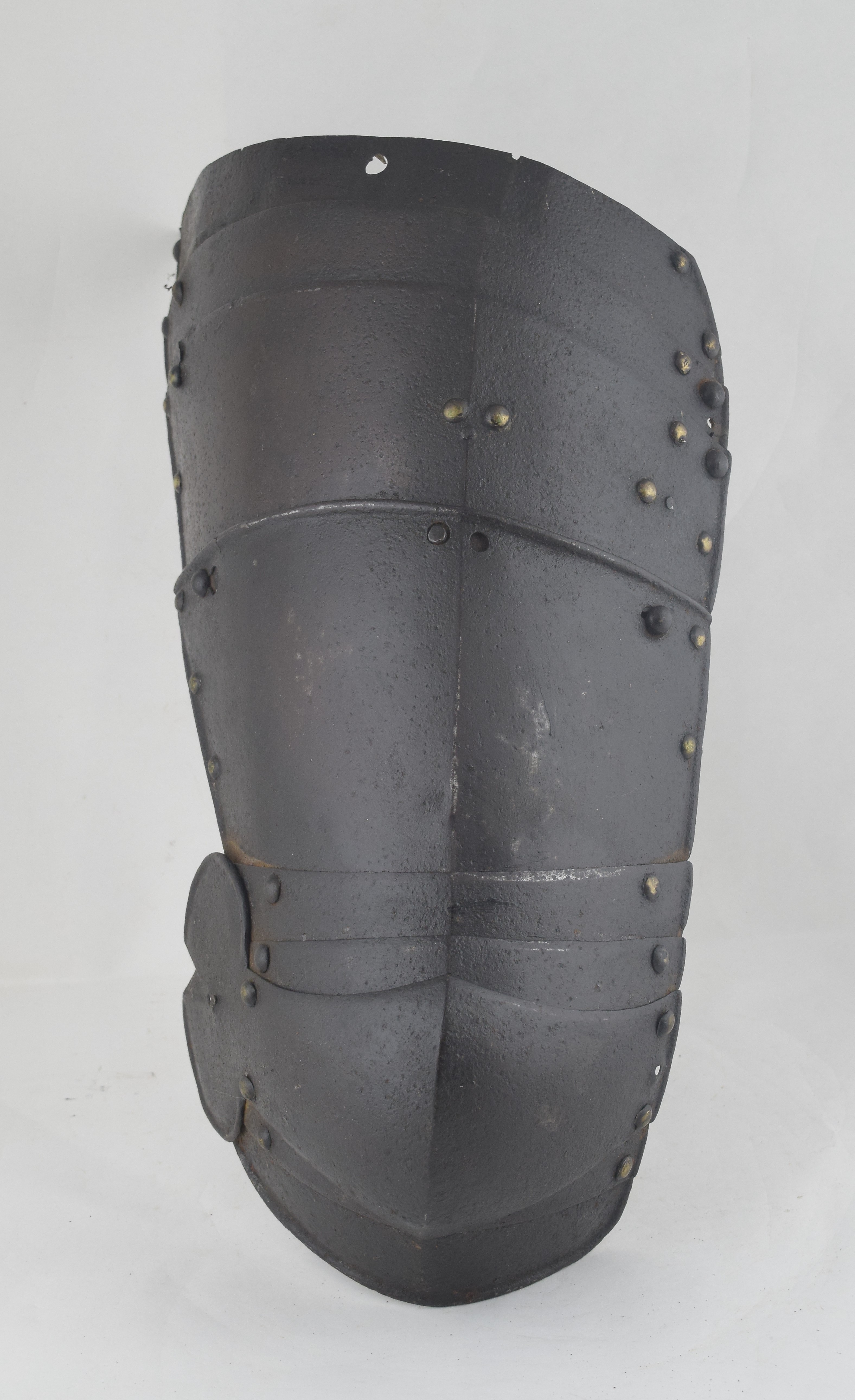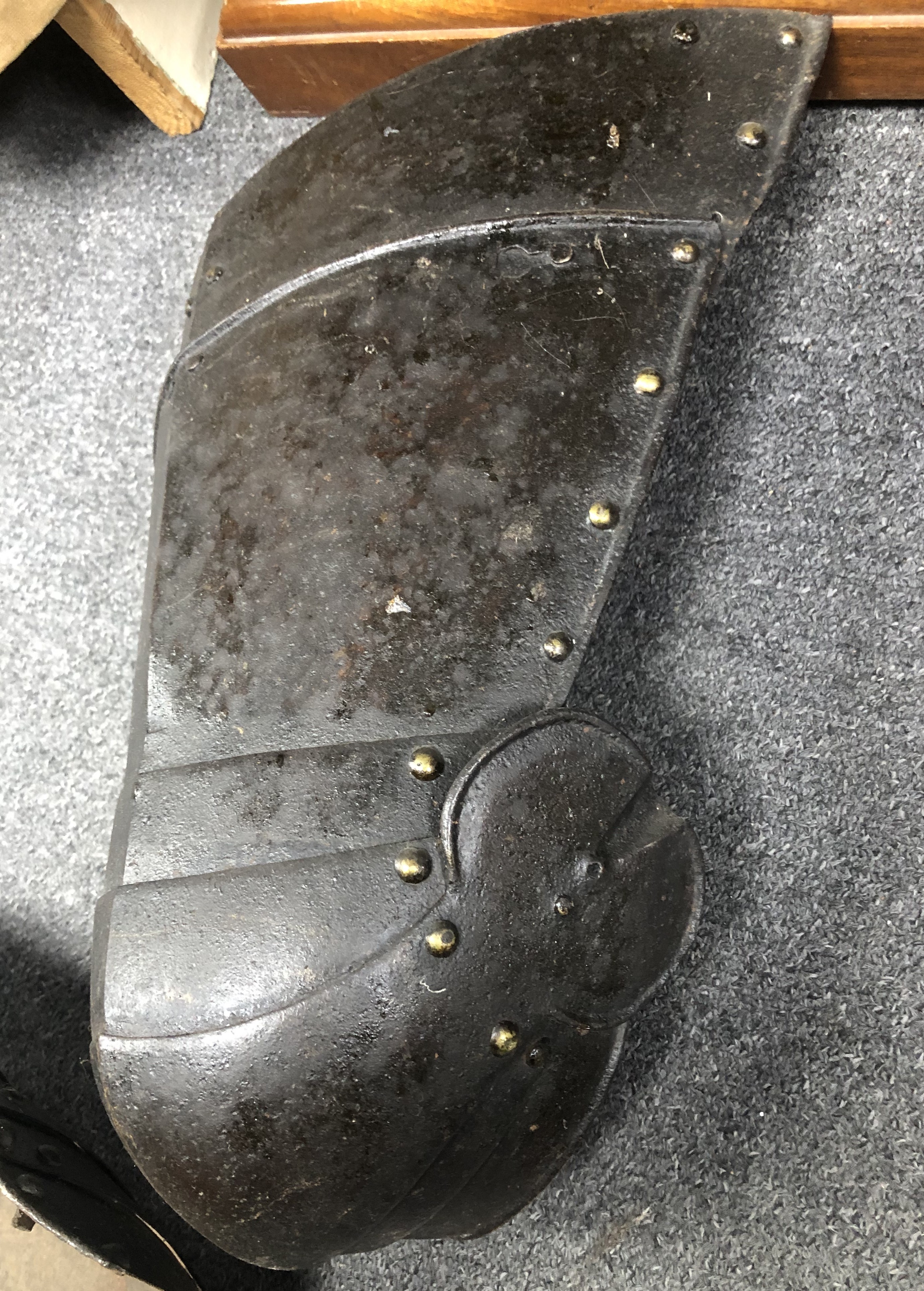 These have unfortunately been somewhat adapted to form tassets. The top plate on the right has been trimmed at the upper edge and a single hole added to engage the post at the waist of a cuirassier breastplate. The left has lost its (likely two) top plates.
