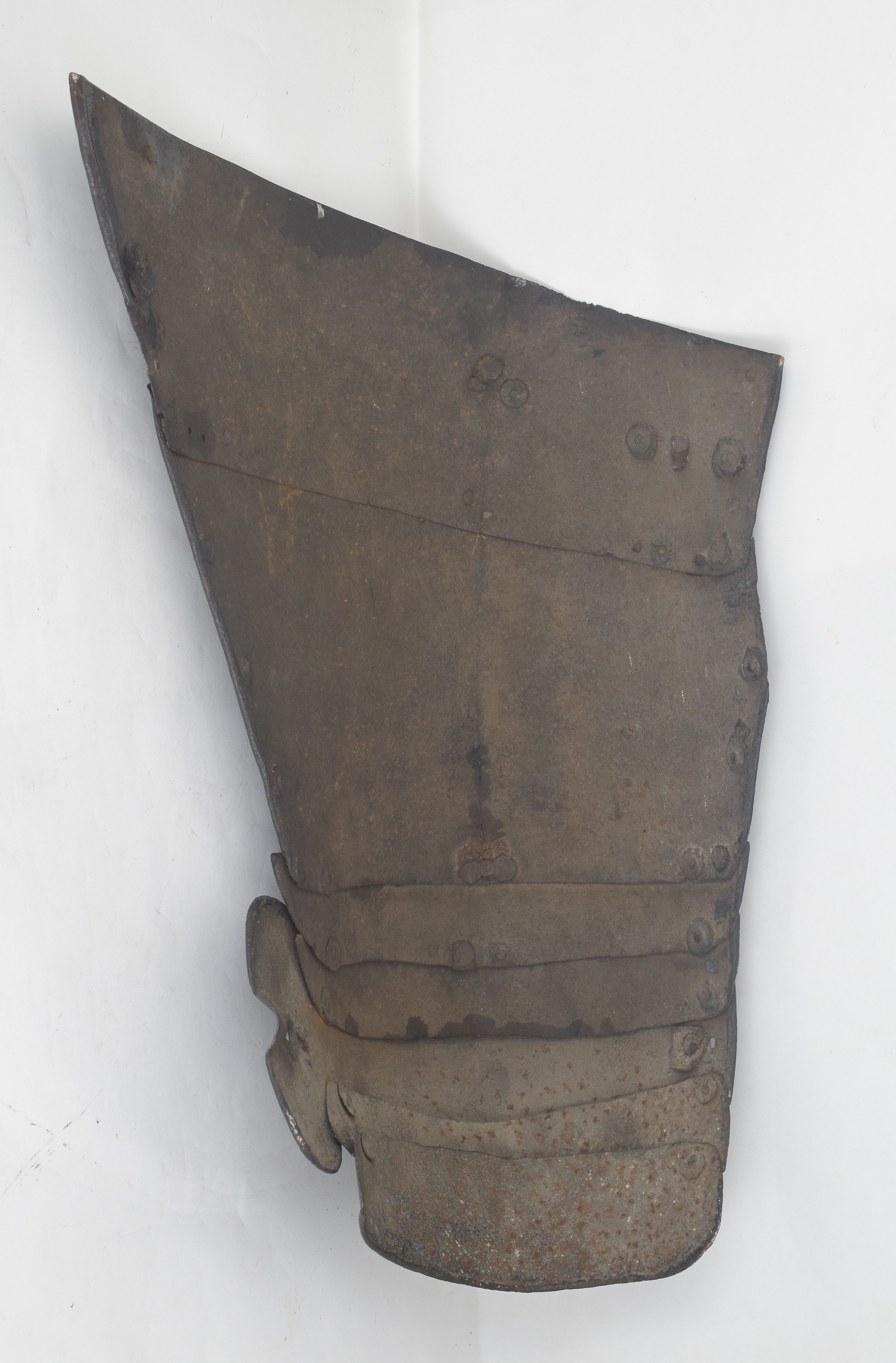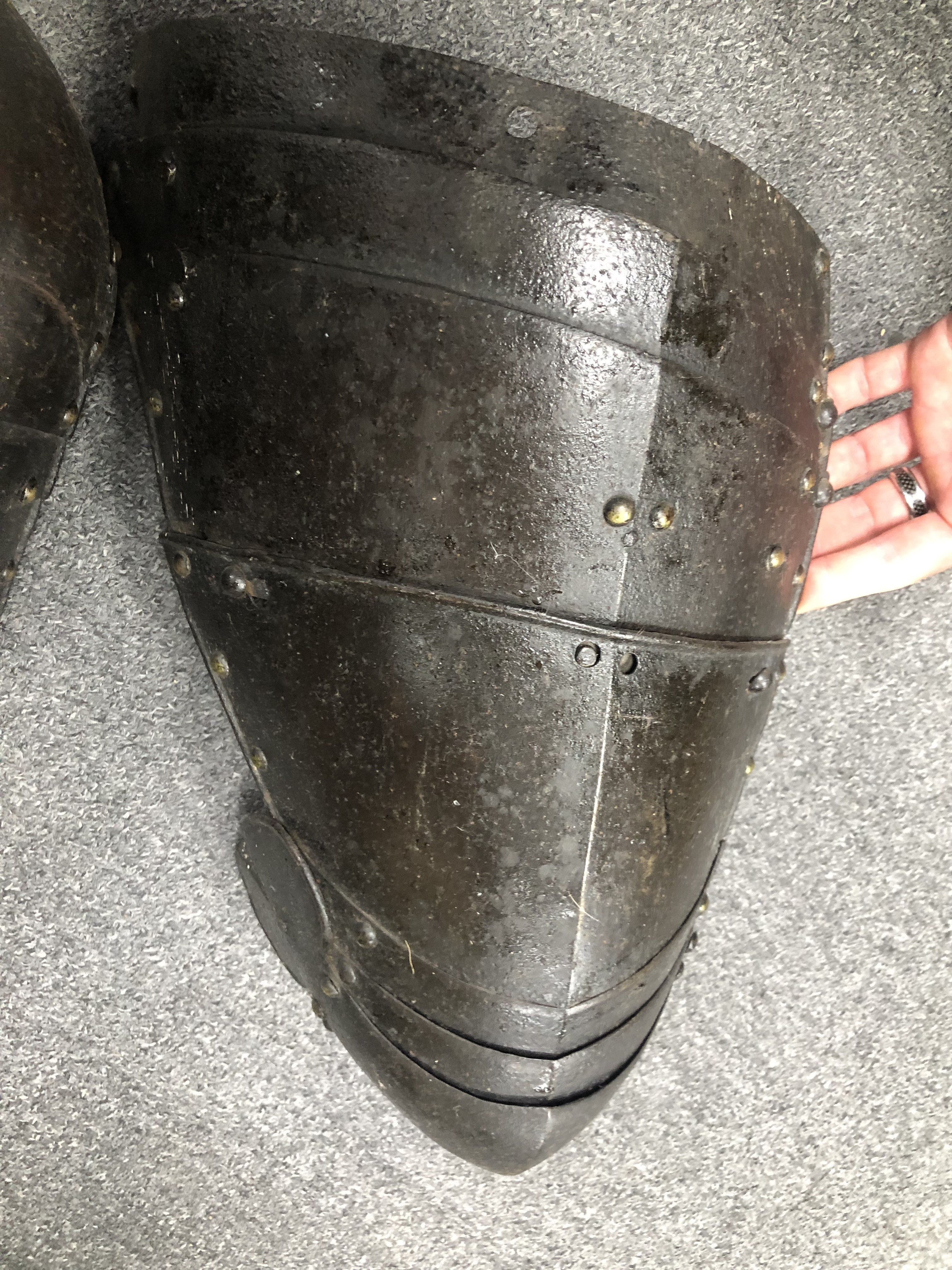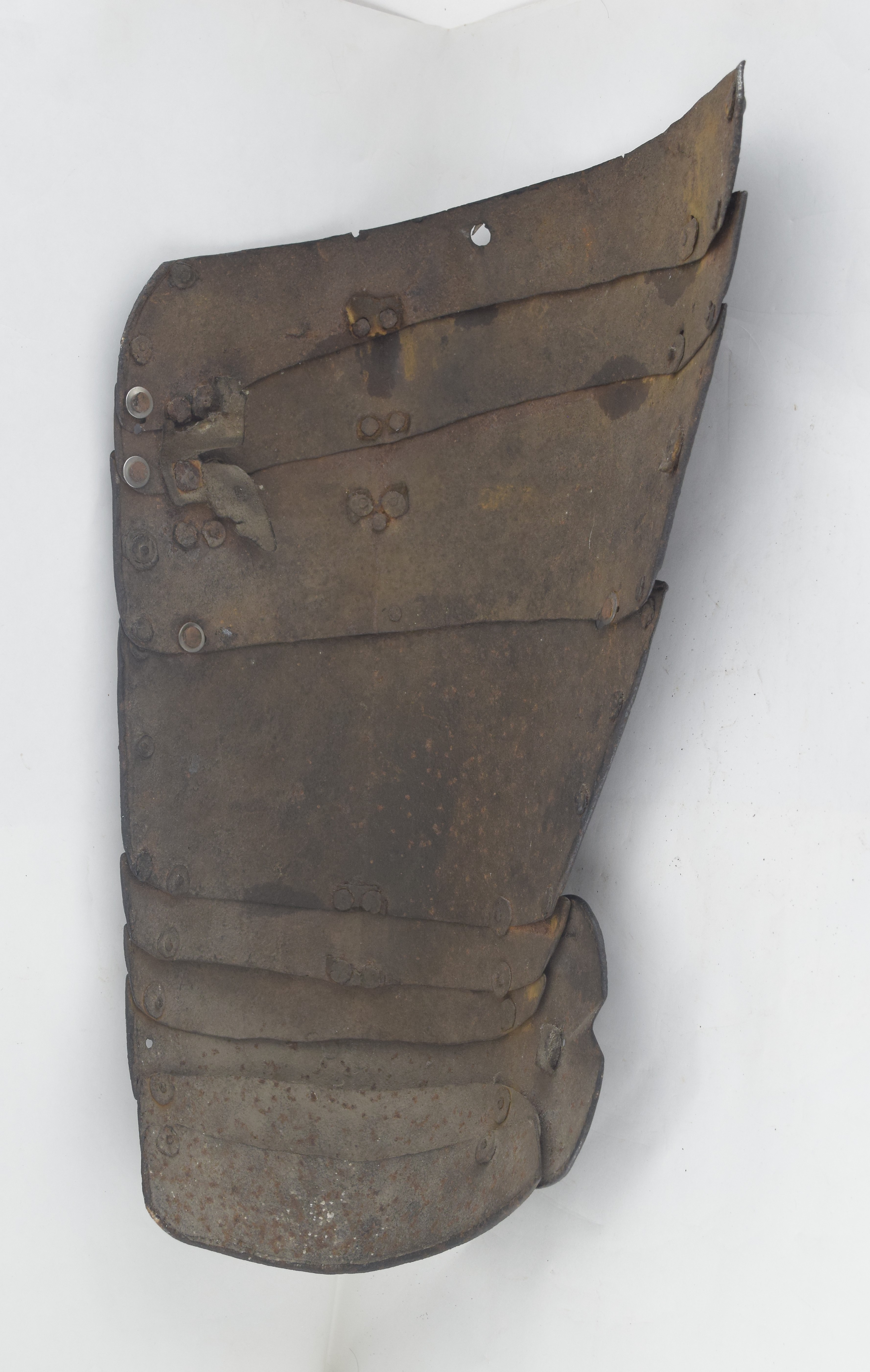 These have unfortunately been somewhat adapted to form tassets. The top plate on the right has been trimmed at the upper edge and a single hole added to engage the post at the waist of a cuirassier breastplate. The left has lost its (likely two) top plates.