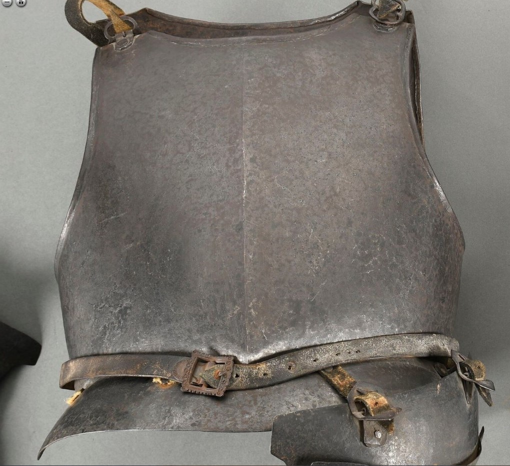 One piece breast with central crease and a waist that drops at the center of the waist to form a simple peascod form. Integral flare at the waist to carry tassets. Arms and neck with plain inward turns. Buckles at the shoulders to secure the backplate's shoulder straps. Rivets in the flare for leathers to secure tassets (broken). Marked under the right arm on the outside with "154" in a font that seems to be the same as many stamped inventory numbers found on pieces that have come from (or remain in) the Solothurn arsenal. Marked on the interior of the flare with two parallel chisel marks.
