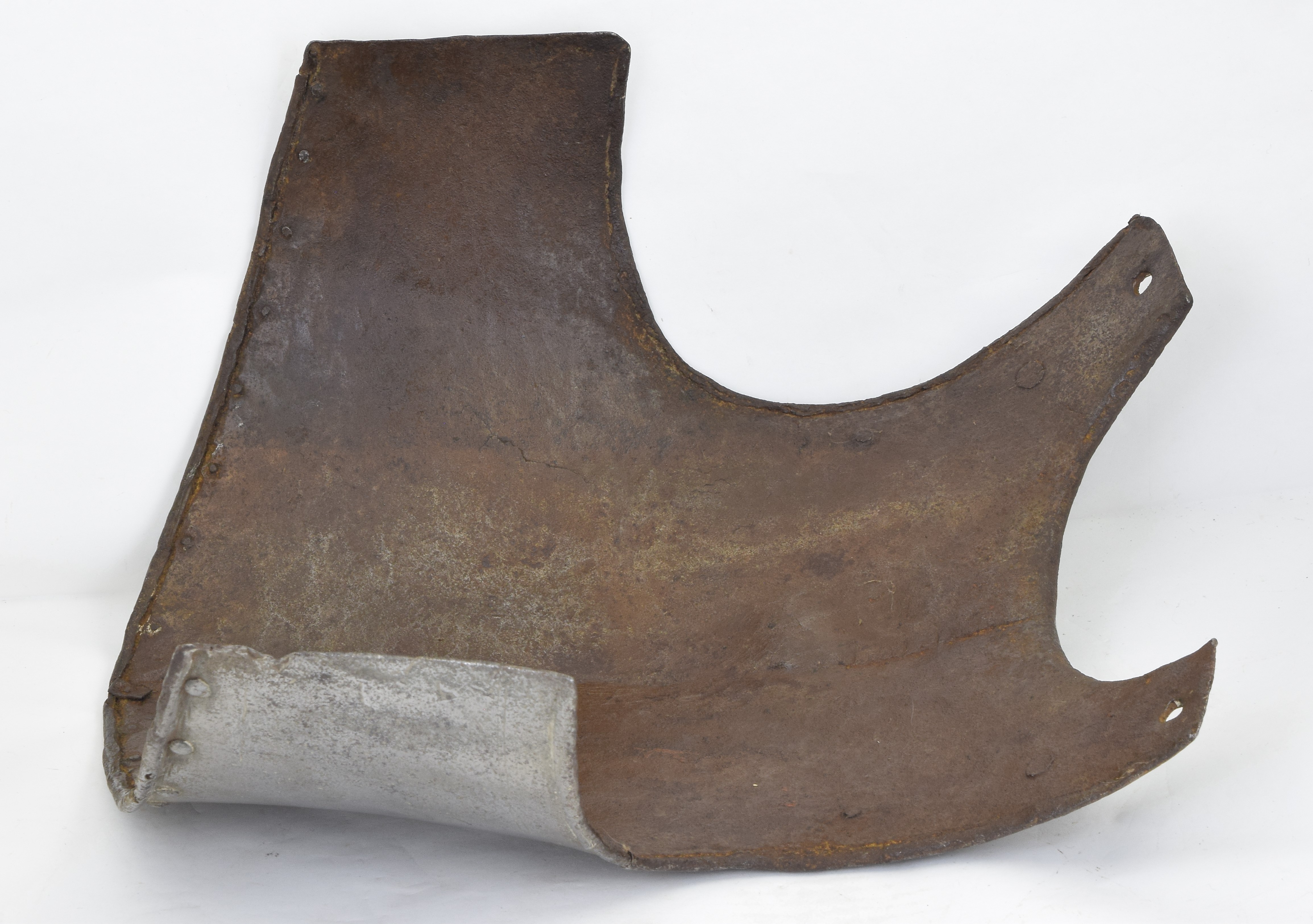 Nearly flat form with central crease. Rolls at the waist, arms and neck. The neck hole is relatively broad and not turned up to form an integral neck protection. The roll at the neck turned out, the rolls at the arms turned in and the roll at the waist turned in over a wire. Proof mark. Studs at the shoulders to secure shoulder straps. Additional pair of filled holes above the current studs. Double incised lines at the arms and neck and parallel to the center crease on each side. Line of rivets at the waist. This may have been made originally in this configuration, or it may have been adapted from a more typical breastplate with a flare at the waist. The neck line is similar to those on breastplates which are designed to be worn with a gorget. Marked near the neck with RH, 30 and a third less clear mark over the RH that appears to be the center and right arms of a crown, the left damaged by pitting. The RH mark (and possibly the crown) showing signs of a double strike. RH with a crown over it is described as the mark of Richard Holden (or Hoden) on page 44 of "The London Armourers of the 17th Century" by Thom Richardson. Atypically, there is a lot of information about him. Richard Holden was made free in 1665, indicating that this piece (if it is his) would have been made after that date. Richard Holden has been identified as the maker of the famous harquebus armour for James II made in 1686 which survives in the Royal Armouries (II. 123). Surface with heavy pitting. After aquisition very lightly cleaned to remove active rust (scalpel cleaned) and remove old varnish or wax coating.
