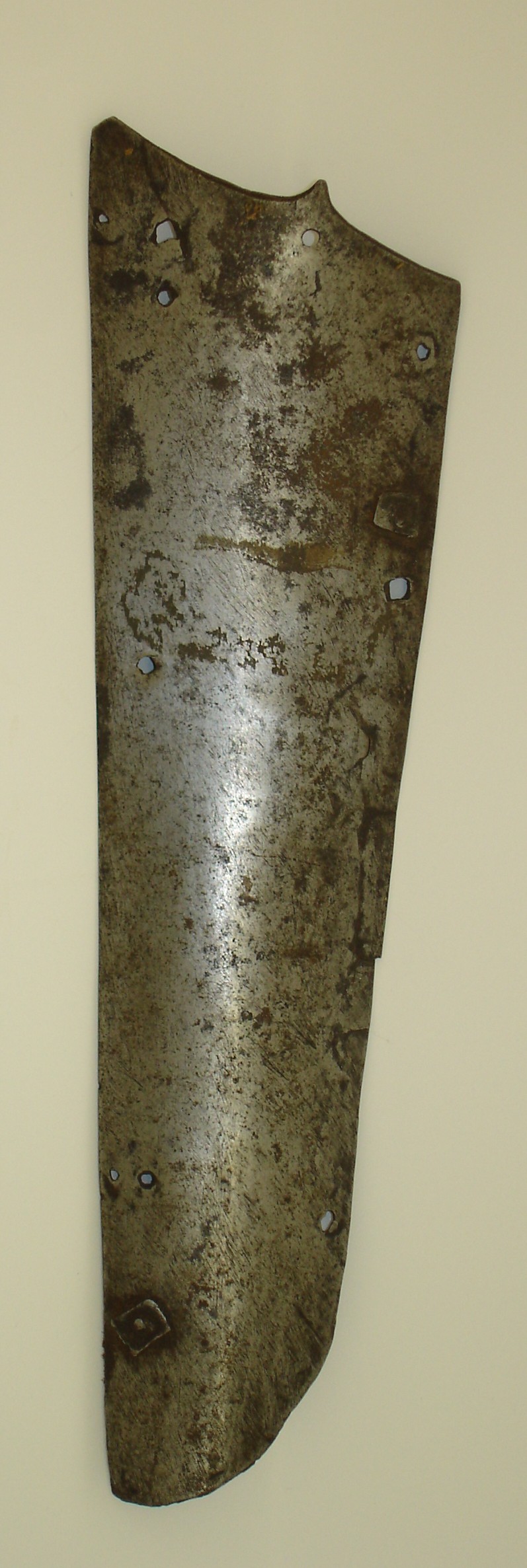 This plate provided additional protection for the side of the leg. 12' tall. Holes for attachment of hinges and other plates. Point at the top over the hole used to attach the upper plates. Beveled top edge.