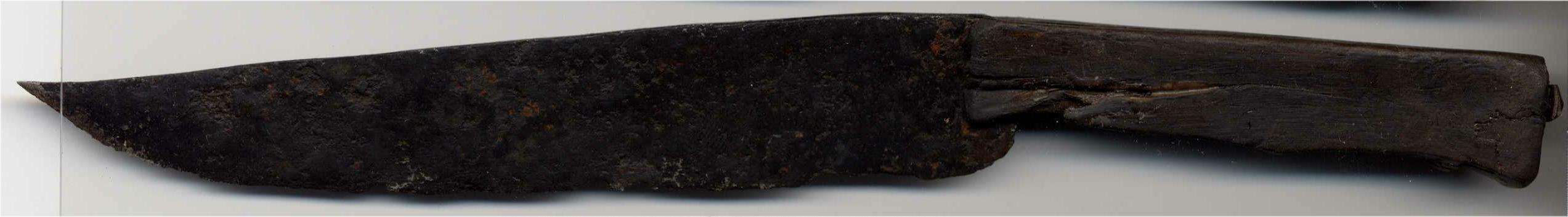unmarked, with hooked tip blade, squared wooden haft, through tang and small square plate. From Dordrecht. Ex. Coll. Simon Moore #2000.53. Overall 9 inches long. Handle 3 3/8 inches long, 1/2 to 3/4 wide and 5/16 thick where it is not spread by splitting. Blade 5 7/8 inch long, app. 7/16 wide at the handle. Blade app. .15 in. thick right at the back base of the blade, back tapering to .125 within 1/2 inch, then down to .10 and then .08 near the inventory number. Pretty evenly tapered toward the edge.